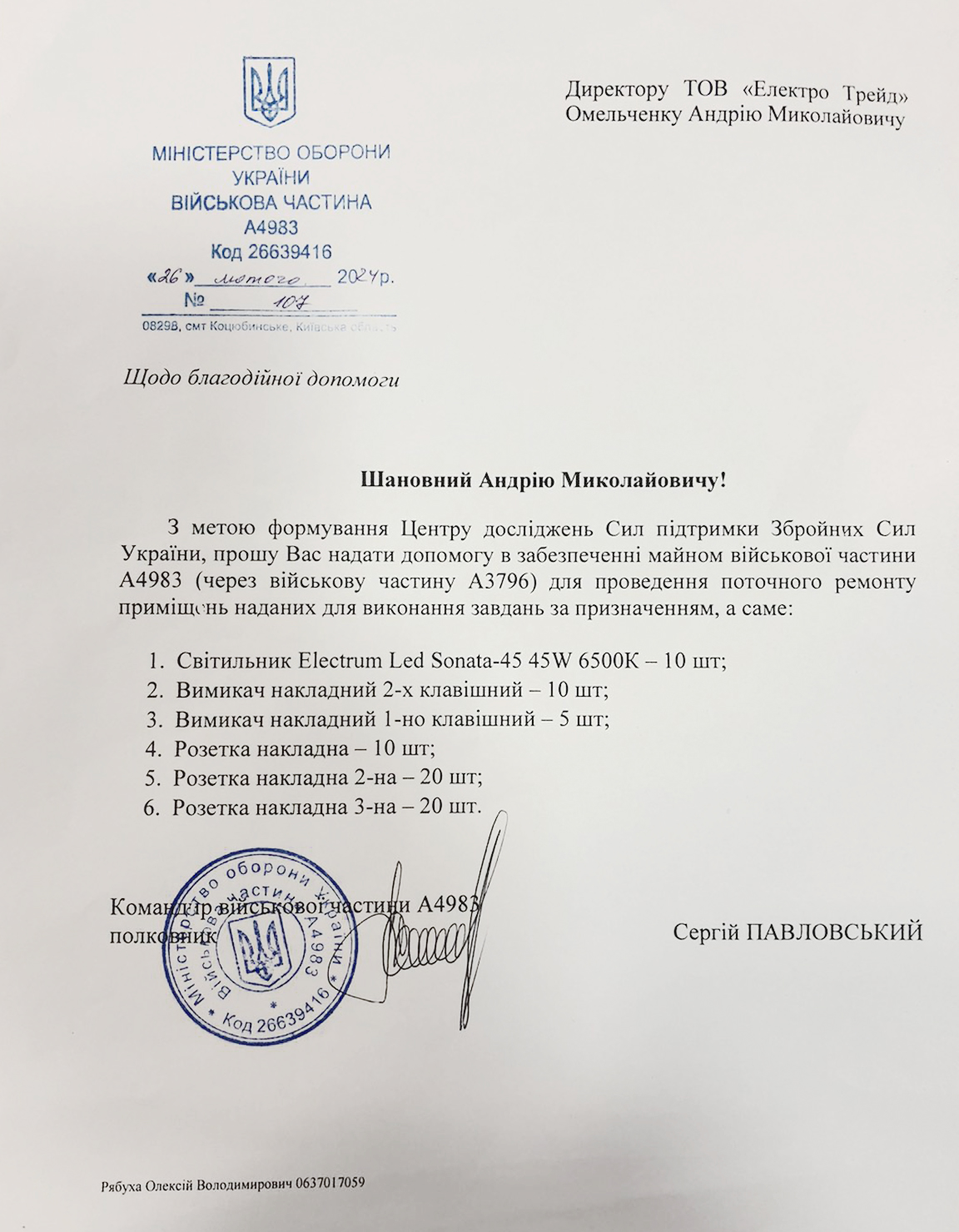 Допомогли в/ч із придбанням електрообладнання | Электрика-ШОП