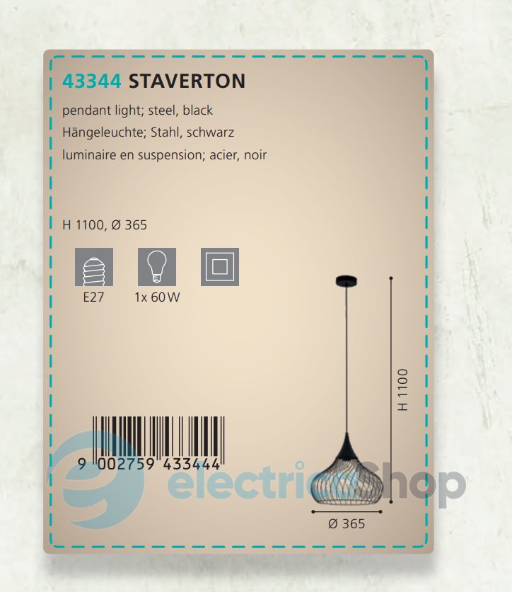 Люстра STAVERTON 43344 австрийского бренда EGLO будет отлично смотреться в современном интерьере, дополнит дизайн любого помещения. Изготовлена из стали, покрытие черного цвета.
