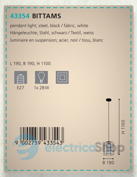 Люстра BITTAMS 43354 австрийского бренда EGLO будет отлично смотреться в современном интерьере, дополнит дизайн любого помещения. Основа изготовлена из стали черного цвета, абажур текстильный.