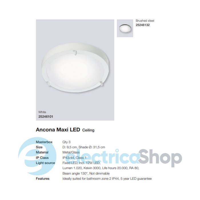 Потолочный светильник Nordlux ANCONA MAXI 25246101 LED будет отлично смотреться в современном интерьере. Изготовлен из металла и стекла, имеет встроенный LED-модуль на 12W, цветовая температура – 3000K (теплый белый).