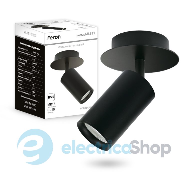 Светильник-спот Feron ML311 черный поворотный поворотный используется для освещения торговых центров и административных помещений, кафе и ресторанов, выставочных залов, а также для бытовых помещений и интерьерной подсветки. Применяется для основного и направленного освещения. Имеет удобную регулировку направления светового луча: на 350° в горизонтальной плоскости, на 90° в вертикальной плоскости.
