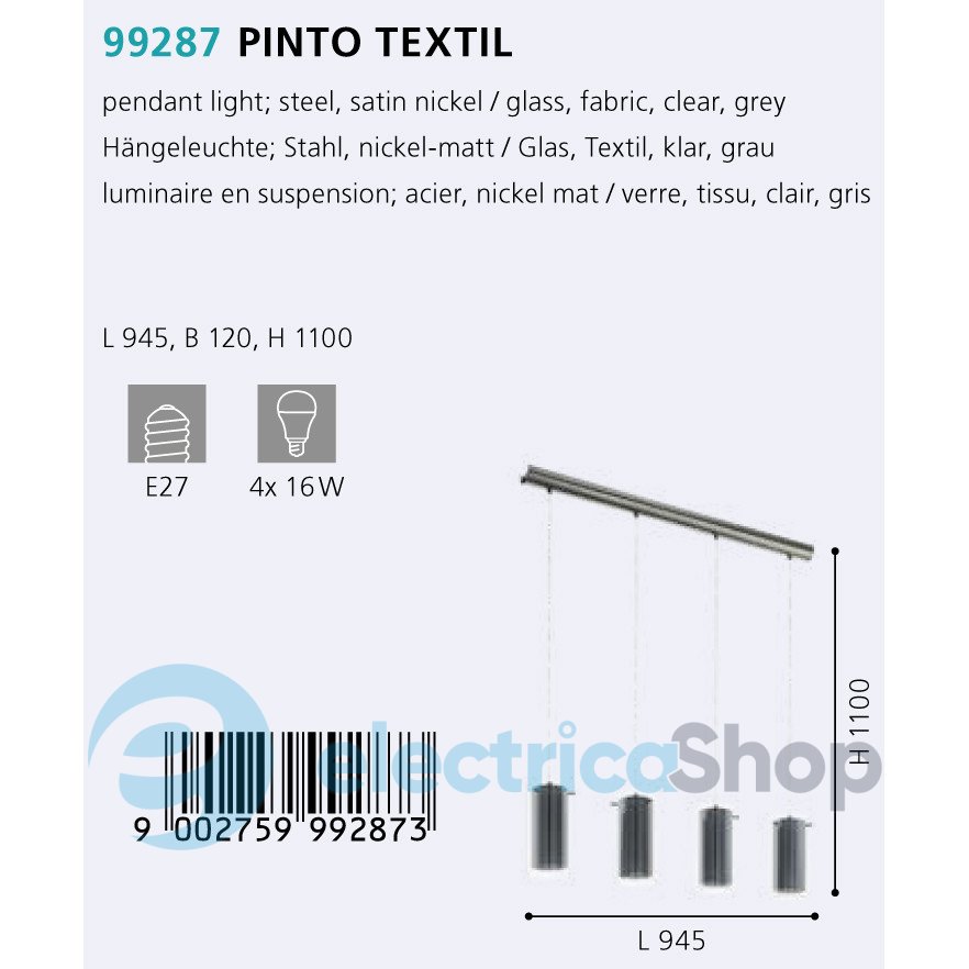 Подвесной светильник PINTO TEXTIL 99287 австрийского бренда Eglo™ станет настоящим украшением для современного интерьера. Основа изготовлена из металла, текстильный абажур в стеклянном плафоне.
