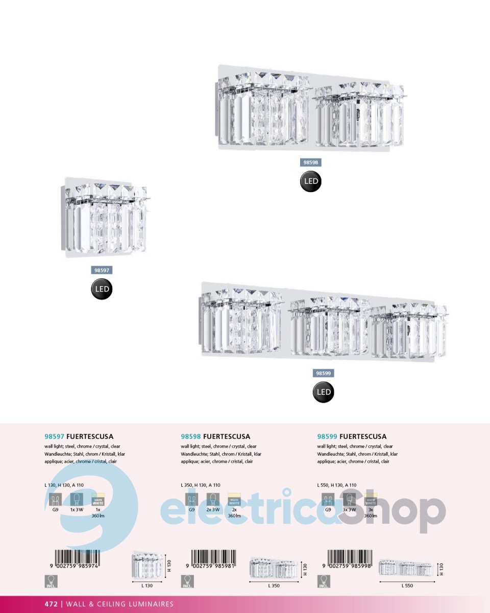 Бра FUERTESCUSA 98599 австрийского бренда Eglo™ станет настоящим украшением для современного интерьера, подойдет для помещений в стиле модерн и классика. Изготовлен из стали, плафоны декорированы хрусталем.