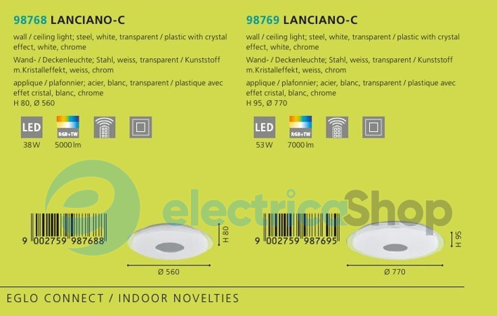 Светодиодный светильник Eglo 98769 LANCIANO-C LED хорошо впишется в интерьер, оформленный в современном стиле. Арматура выполнена из стали, плафон – из пластика c эффектом хрусталя. Доступна регулировка температуры и мощности света с помощью пульта ДУ (в комплекте), есть функция RGB. Возможно управление со смартфона.