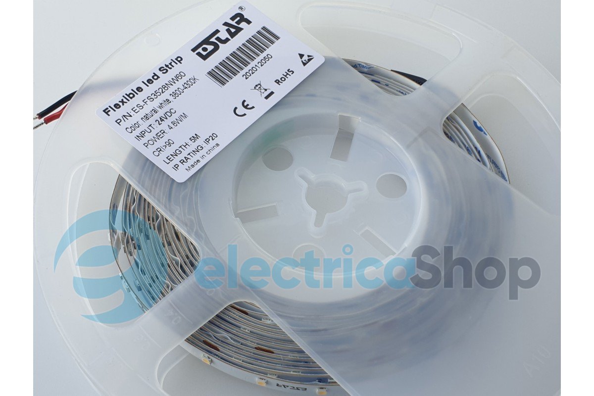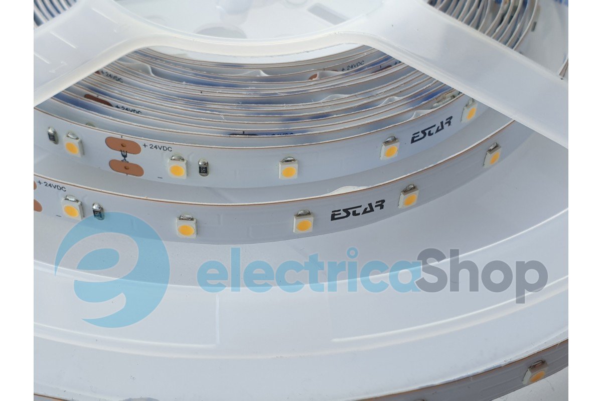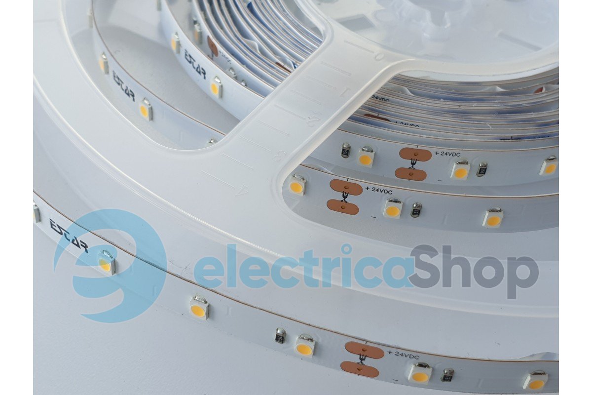 Светодиодная лента ESTAR SMD 3528 60 24V Elit представляет собой гибкую печатную плату с расположенными на ней SMD-диодами нейтрального белого свечения (диоды поверхностного монтажа) в количестве 112 штук на 1 метр ленты. Цвет подложки – белый. Степень защиты IP20 означает, что лента негерметичная (открытая) и не защищена от влаги, механических и других внешних воздействий, поэтому она предназначена для установки внутри различных закрытых конструкций и в помещениях с низким уровнем влажности.