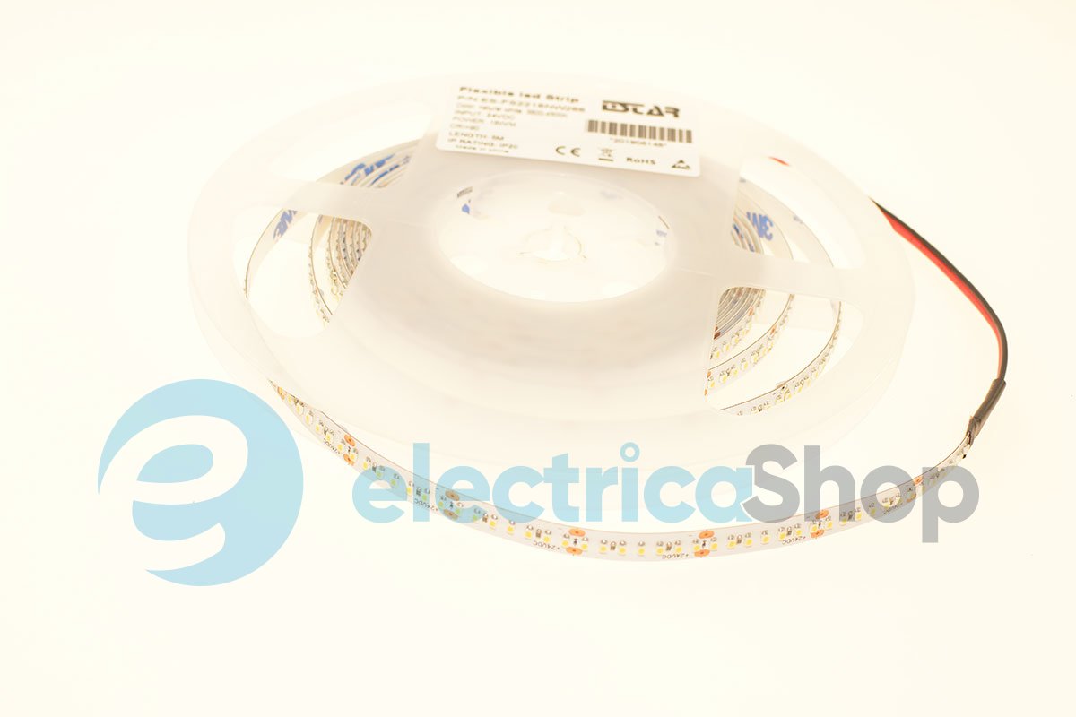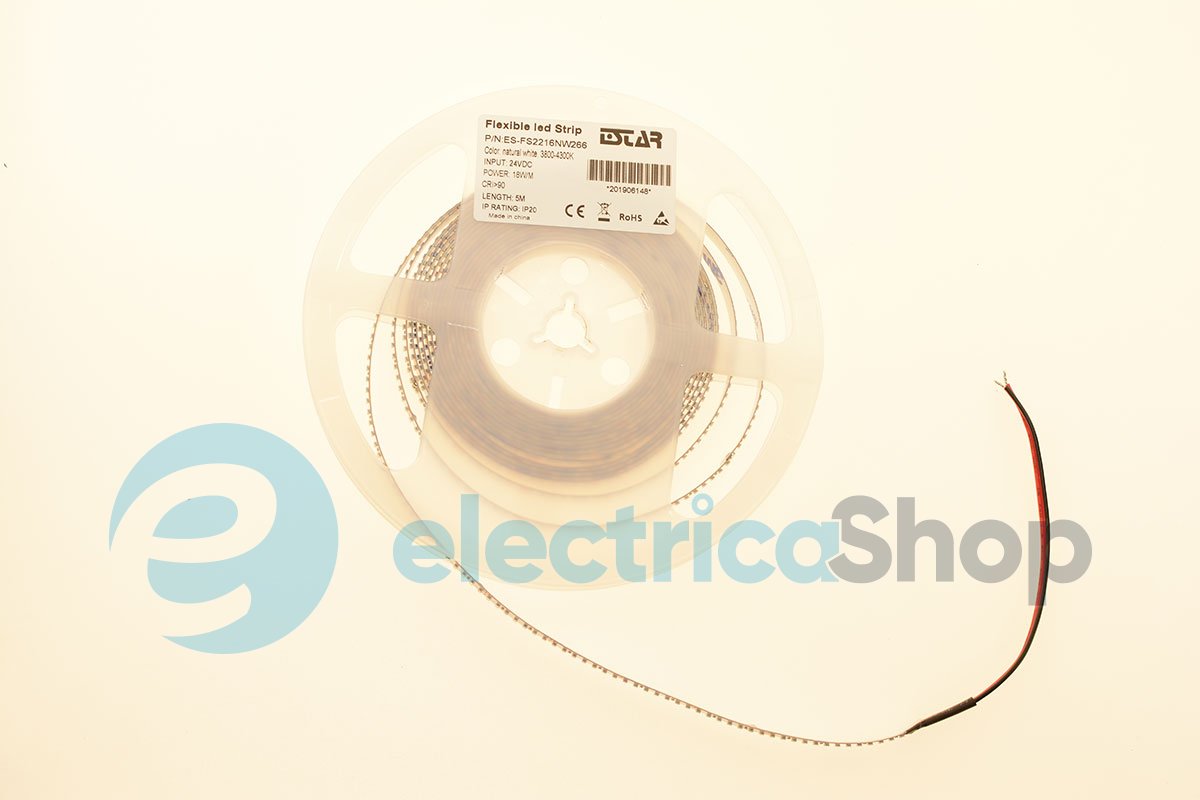 Светодиодная лента ESTAR SMD 2216 266 24V Elit представляет собой гибкую печатную плату с расположенными на ней SMD-диодами нейтрального белого свечения (диоды поверхностного монтажа) в количестве 266 штук на 1 метр ленты. Цвет подложки – белый. Степень защиты IP20 означает, что лента негерметичная (открытая) и не защищена от влаги, механических и других внешних воздействий, поэтому она предназначена для установки внутри различных закрытых конструкций и в помещениях с низким уровнем влажности.