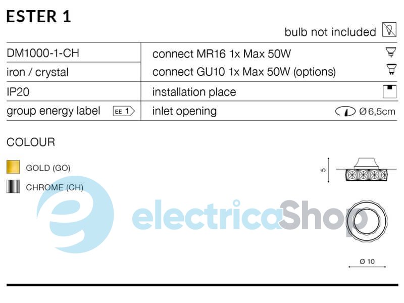 Точечный светильник Azzardo Ester 1 AZ4175 из серии Exclusive downlights будет хорошо смотреться в классических интерьерах, например, в сочетании с хрустальными люстрами. Выполнен из металла и декорирован хрусталиками.