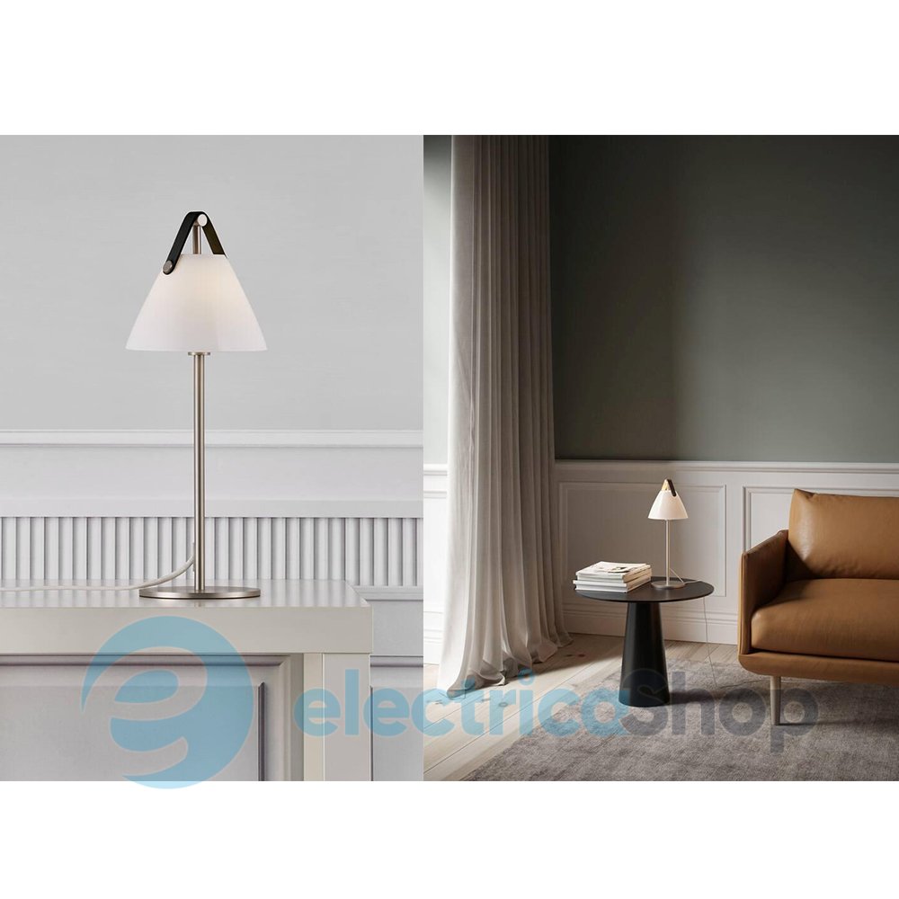 Лампа изготовлена в современном скандинавском стиле, сочетание элементов из кожи, металла и стекла делают предмет освещения незаменимой частью современного интерьера. В комплект входит 2 ремешка черного и коричневого цвета. Используется с LED-лампами.