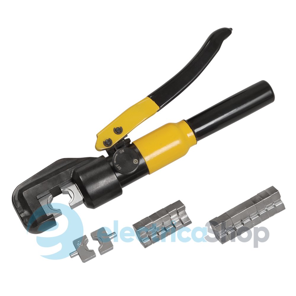 Гидравлические прессы позволяют создавать механические соединения типа кабельная жила-гильза или кабельная жила-наконечник с помощью механической опрессовки. Изделие снабжено сменными матрицами, предназначенными для различных сечений жил.