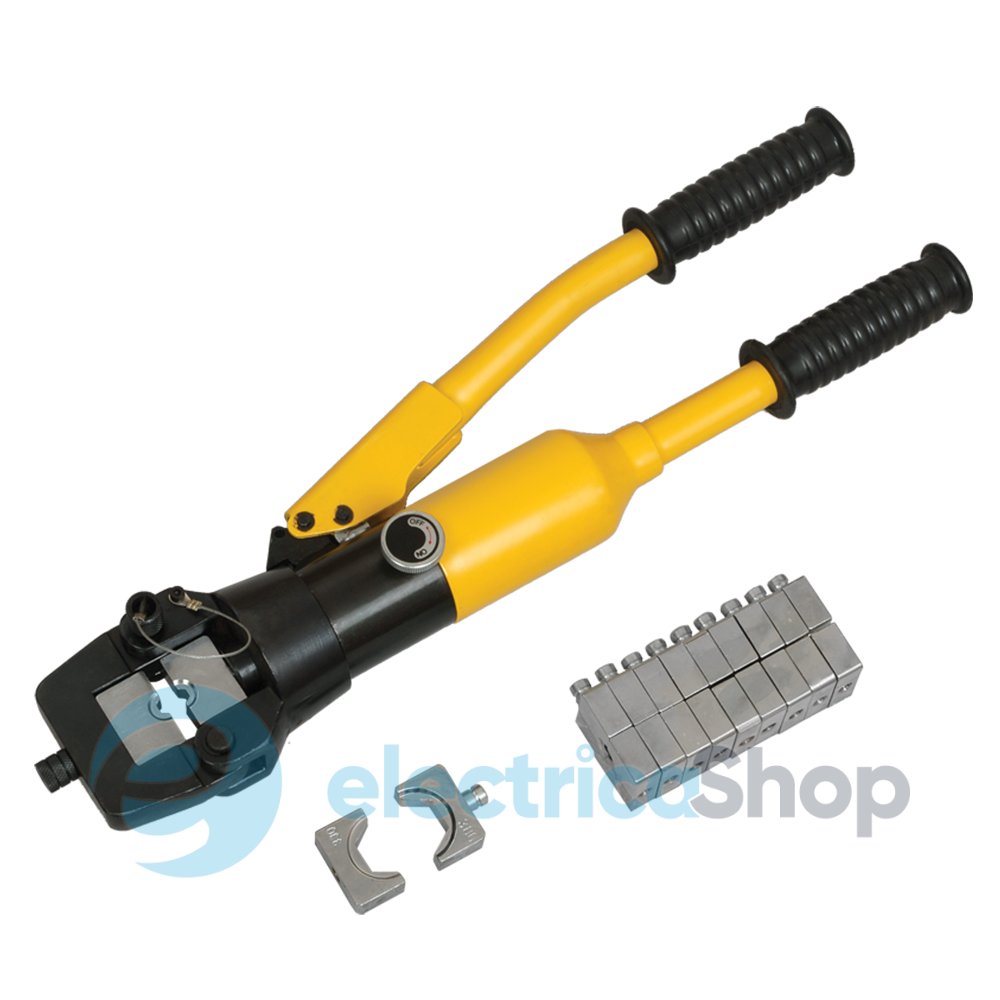Гидравлические прессы позволяют создавать механические соединения типа кабельная жила-гильза или кабельная жила-наконечник с помощью механической опрессовки. Изделие снабжено сменными матрицами, предназначенными для различных сечений жил.