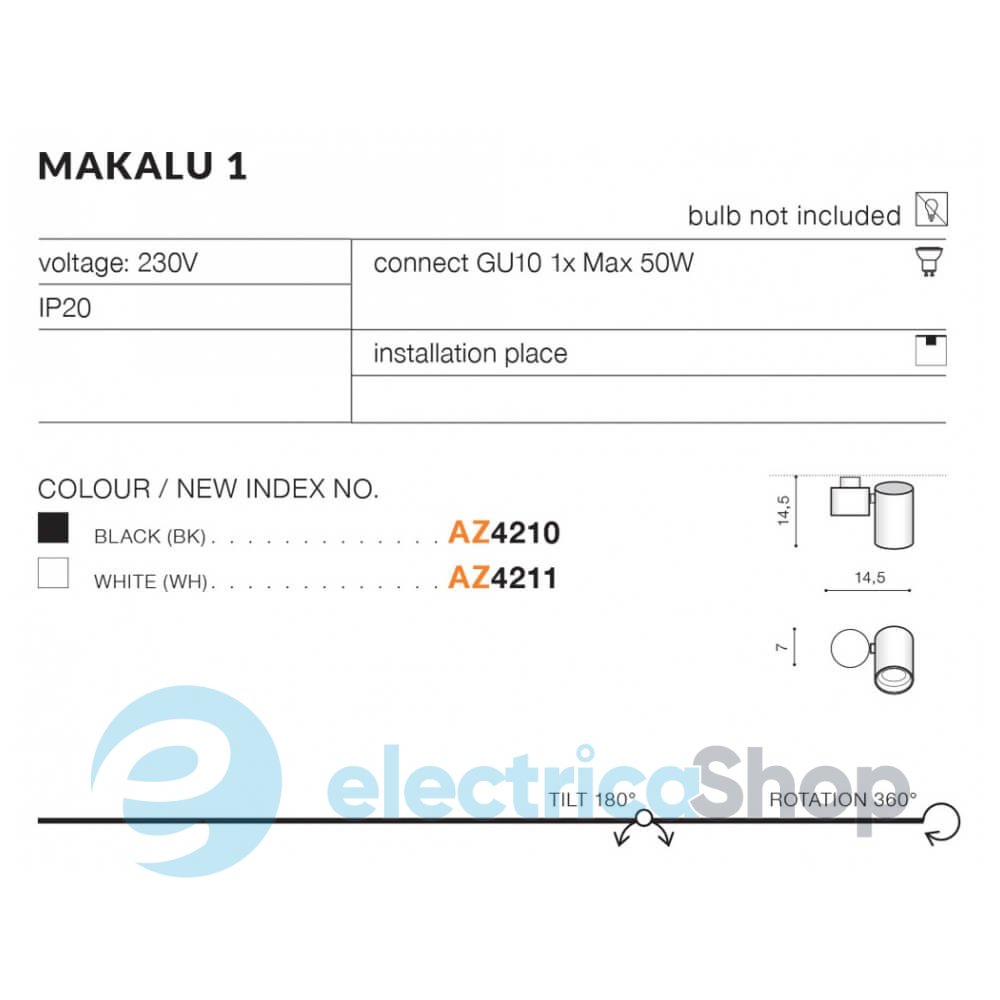 Светильник Azzardo MAKALU 1 AZ4210 подходит для современных дизайнов. Светильник создан в минималистичном стиле, благодаря аккуратным формам и лаконичному исполнению станет хорошим дополнением для жилых и коммерческих помещений. Угол рассеивания света – 180°.
