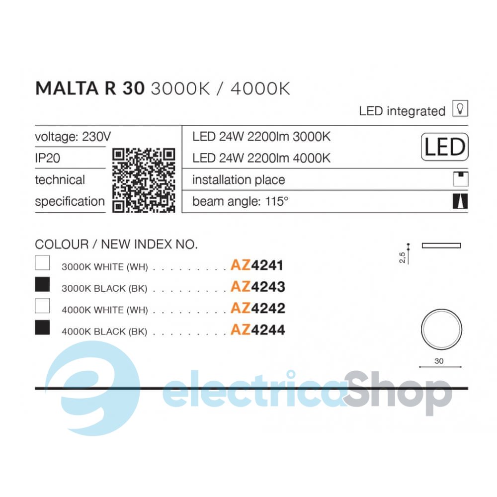 Потолочный светильник Azzardo MALTA R30 AZ4242 станет отличным решением для современного интерьера, его можно использовать как в жилых, так и в общественных помещениях. Универсальное оформление легко впишется в любой дизайн. Имеет встроенный LED-модуль. Светильник изготовлен из алюминия и акрила. Угол рассеивания света – 115°.