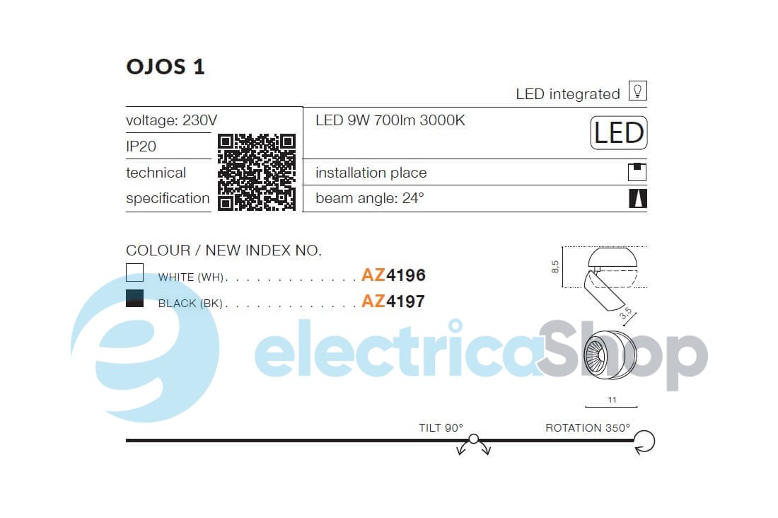 Накладной точечный светильник AZzardo OJOS 1 AZ4196 будет хорошо смотреться в современных интерьерах. Корпус осветительного прибора выполнен из металла. Плафон поворотный, угол рассеивания света – 24°.