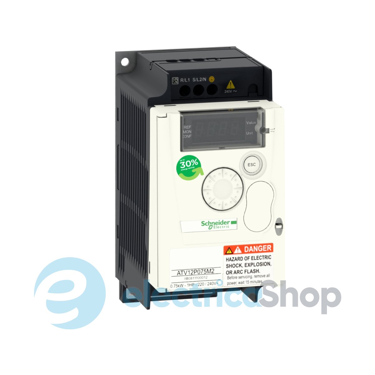 Преобразователь частоты ATV12P075M2 Altivar 12 предназначен для однофазных асинхронных двигателей с питанием от 200 - 240 В и мощностью до 0,75 кВт.