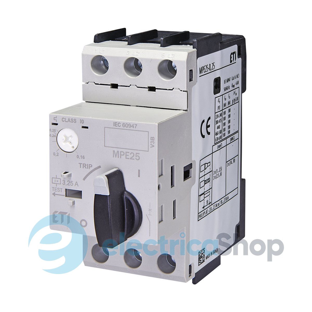 Автоматический выключатель Eti MPE 25-0,25 (каталожный номер 4648002) предназначен для пуска электродвигателей небольшой мощности и их защиты от перегрузок и коротких замыканий.