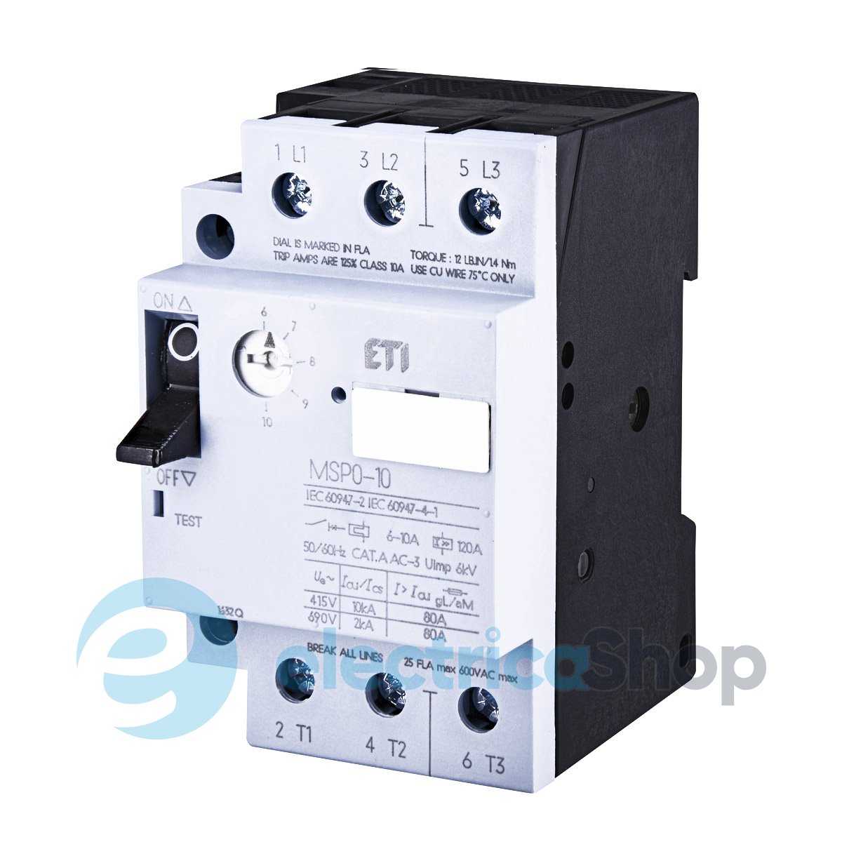 Автоматический выключатель защиты электродвигателя ETI MSP0-10 (код для заказа 4646624) предназначен для пуска электродвигателей до 4,0 kW и защиты его от токов коротких замыканий и перегрузок. Могут выполнять роль главного или аварийного выключателя. Предназначены для эксплуатации внутри помещений при нормальных условиях окружающей среды.