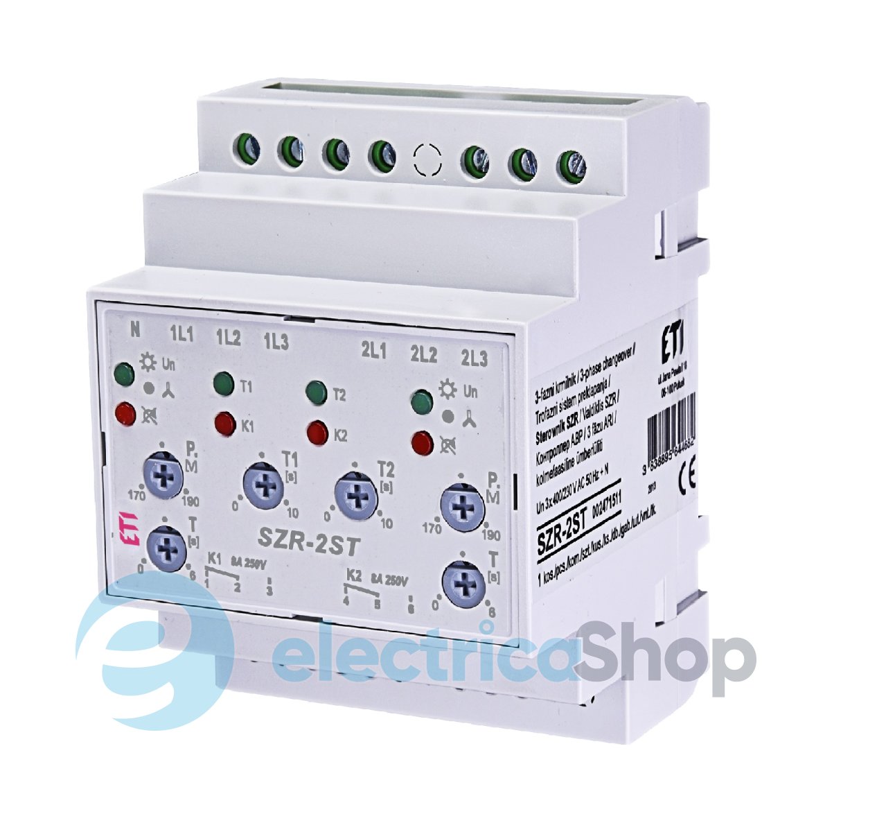 Реле SZR-2ST контролируют параметры основной и резервной сети. Светодиоды и регуляторы на левой стороне реле относятся к основной сети, а на правой – к резервной. В момент пропадания фазы или асимметрии сети реле будет сигнализировать отключением зеленого светодиода (на левой стороне, “Un”) и автоматически отключит питание от основной сети (погаснет светодиод “K1”). Задержка срабатывания при пропадании фазы предотвращает частое переключение в случае кратковременных перебоев в напряжении питания. Затем, по истечении заданного времени, установленного регулятором “Т2”, включится резервное питание, если параметры резервной сети являются правильными. В случае с реле SZR-2ST пользователь имеет возможность задать значение при помощи: “P” – порога срабатывания и “Т” – времени задержки срабатывания реле при пропадании фазы. Время задержки рассчитывается с момента пропадания фазы до момента включения резервной сети и является суммой задержки срабатывания при пропадании фазы (~2 сек или значения “T”) и установленного интервала времени между задержками переключения контакторов (“Т2”).