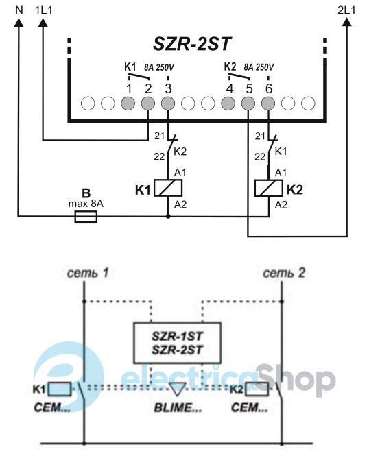 После установки реле на шине TH-35, следует подключить к нему провода основной сети (N, 1L1, 1L2, 1L3) и провода от резервной сети (2L1, 2L2, 2L3). Нулевой проводник N является общим для обеих сетей.ВНИМАНИЕ! ВАЖНО!!! Версия реле SZR-2ST имеет две пары контактов с гальванической развязкой. Способ монтажа показан на схеме ниже.