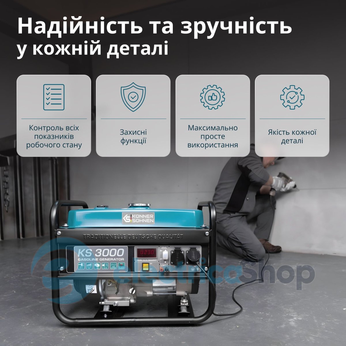 Двигатели Könner & Söhnen отличаются легким стартом и пониженной вибрацией. Линейка бензиновых генераторов KS 3000 оснащена надежным 1-цилиндровым двигателем мощностью 7 л.Легкая и удобная система старта