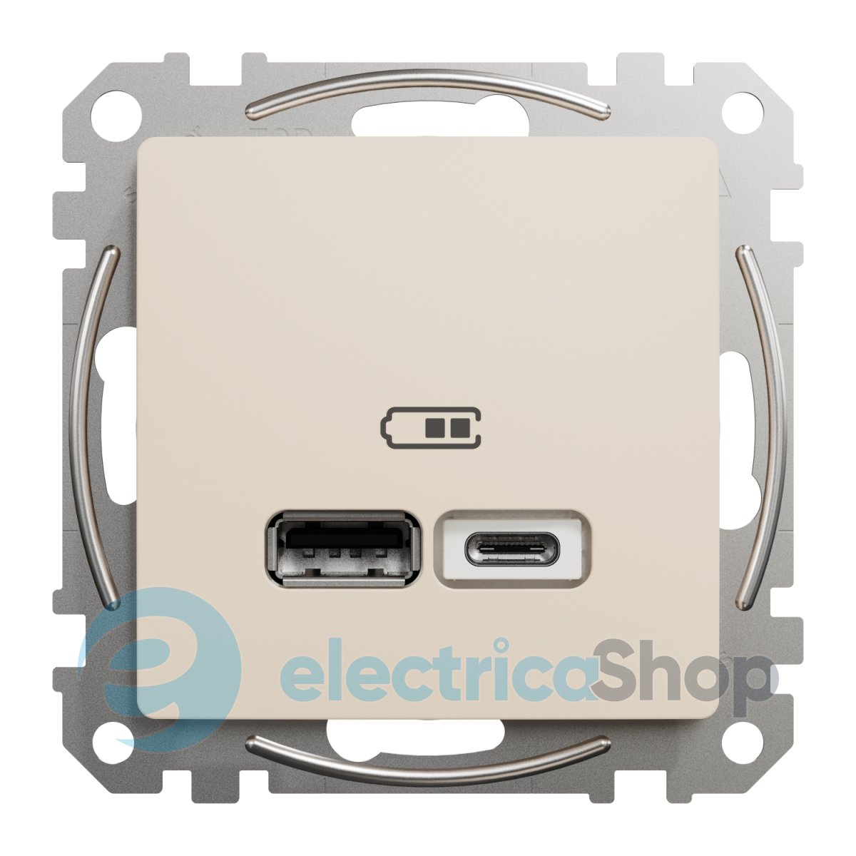 Двойная USB-розетка с разъемами типа А+С представляет собой аксессуар серии Sedna Design & Elements от Schneider Electric. USB-разъем для зарядки имеет глянцевую поверхность бежевого цвета и имеет следующие размеры: