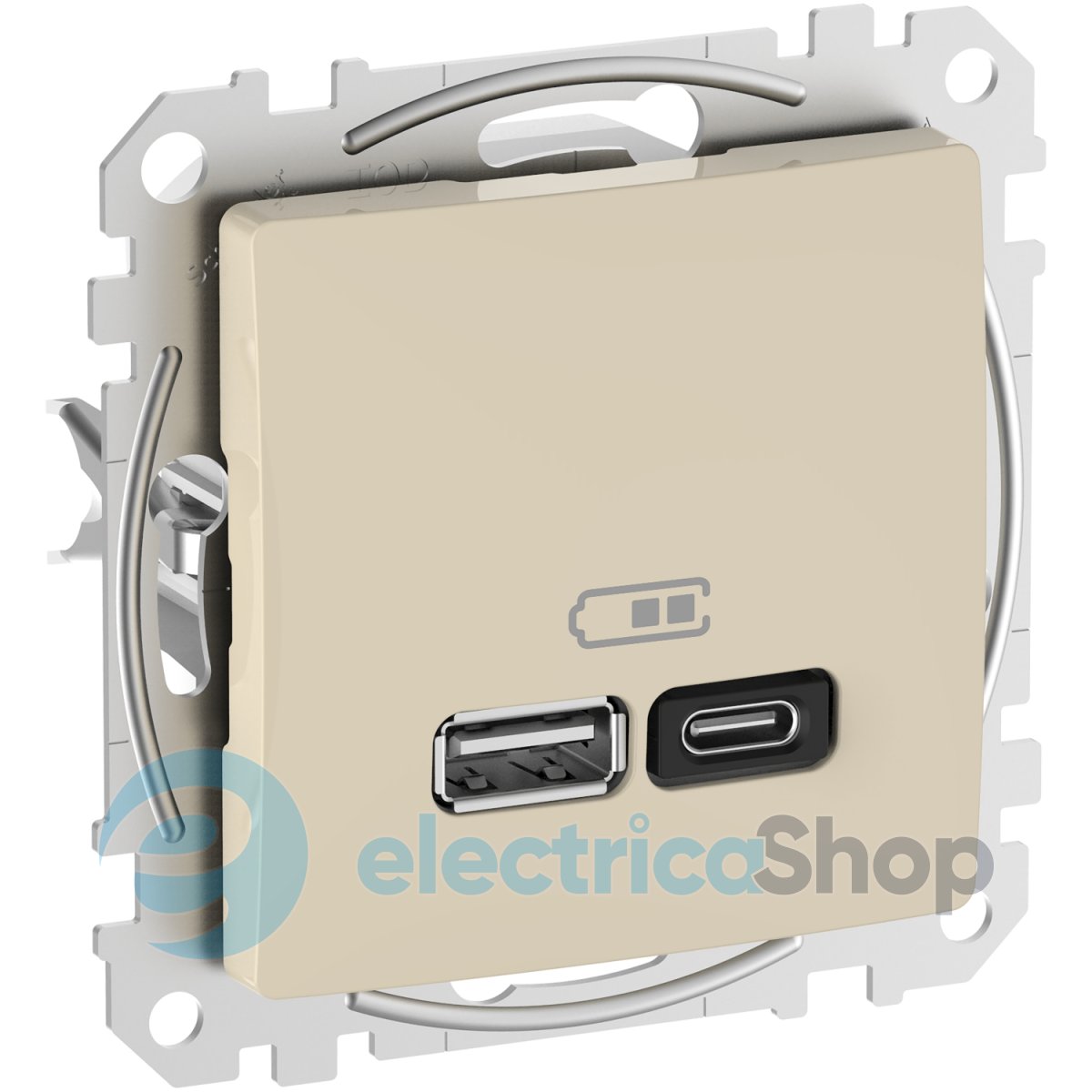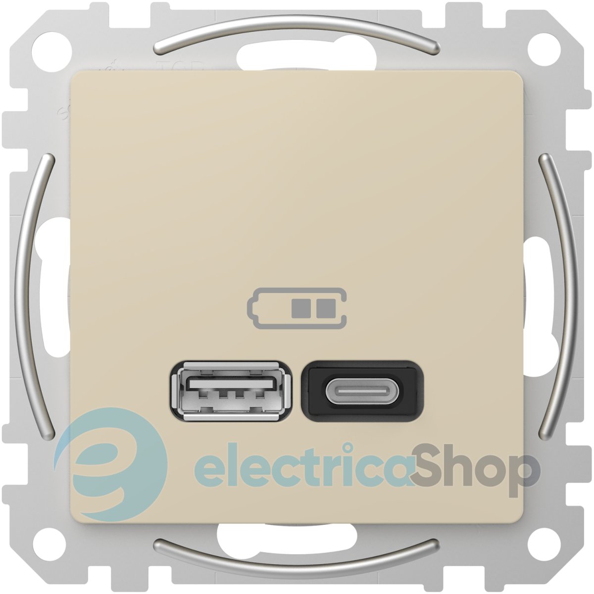 Двойная USB-розетка с разъемами типа А+С представляет собой аксессуар серии Sedna Design & Elements от Schneider Electric. USB-разъем для зарядки имеет глянцевую поверхность бежевого цвета и имеет следующие размеры: