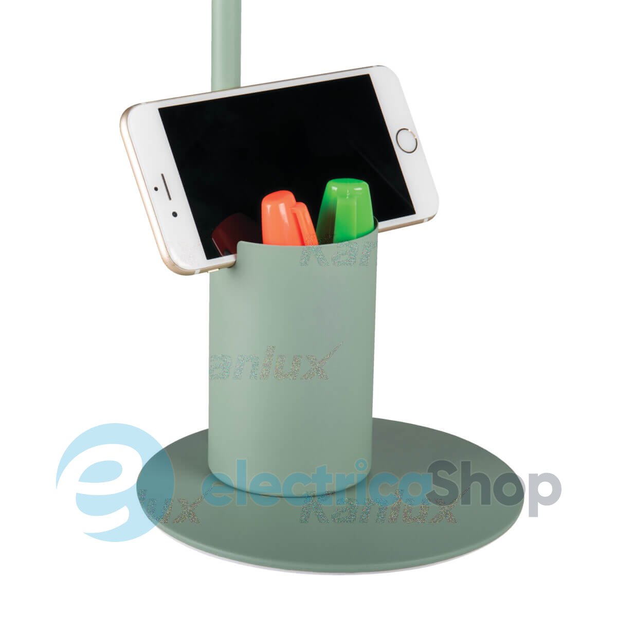 Настольная лампа светодиодная Kanlux RAIBO E27 Green (36284) имеет стильный и лаконичный дизайн. Данная модель не занимает много места, позволяет регулировать направление света. Выключатель находится на проводе. На корпусе есть удобный органайзер для канцелярии и подставка для смартфона.
