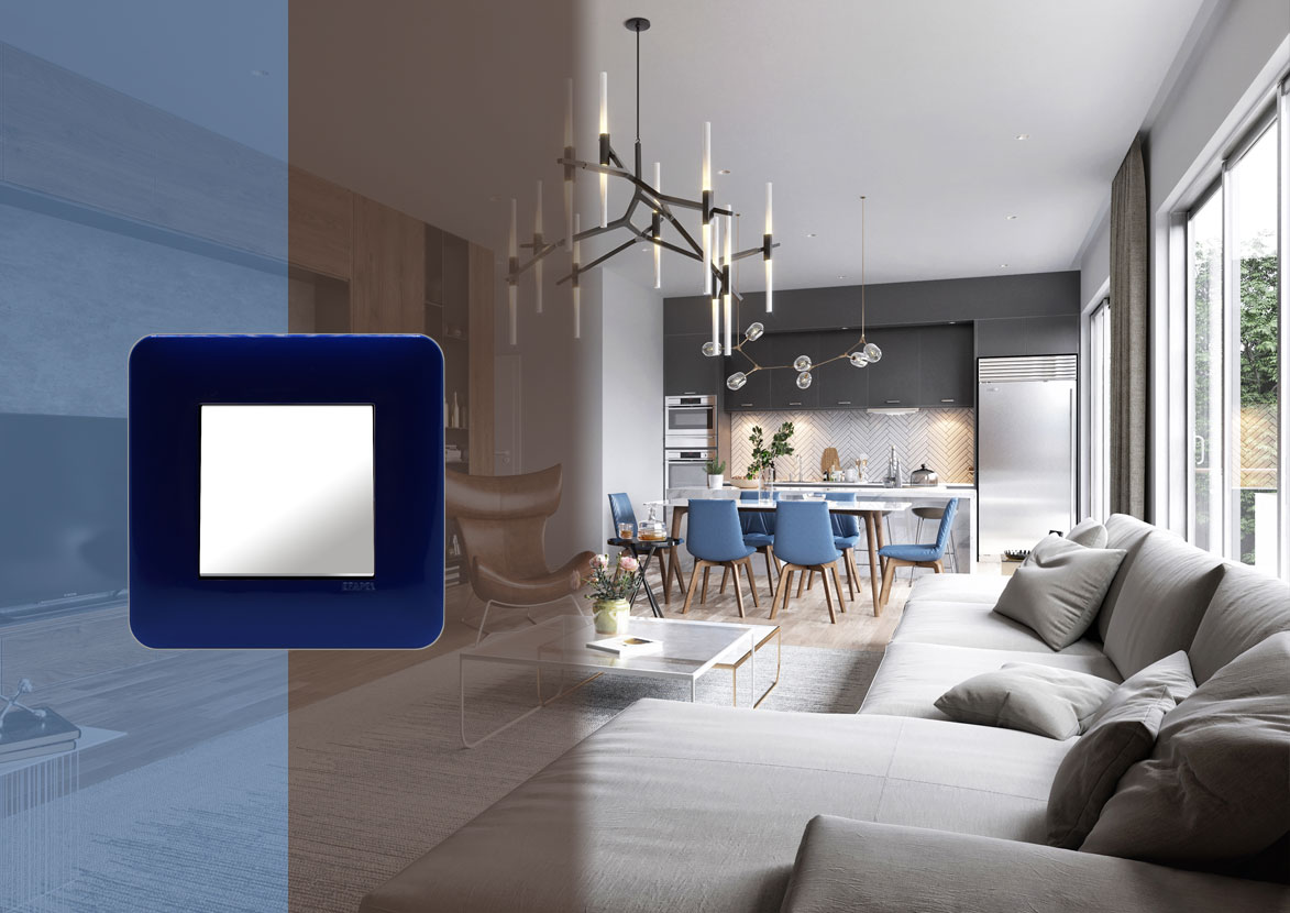 Коллекция LATINA предлагает комплексное решение с простым дизайном для вашего дома.Пример синих рамок Latina Efapel в интерьере