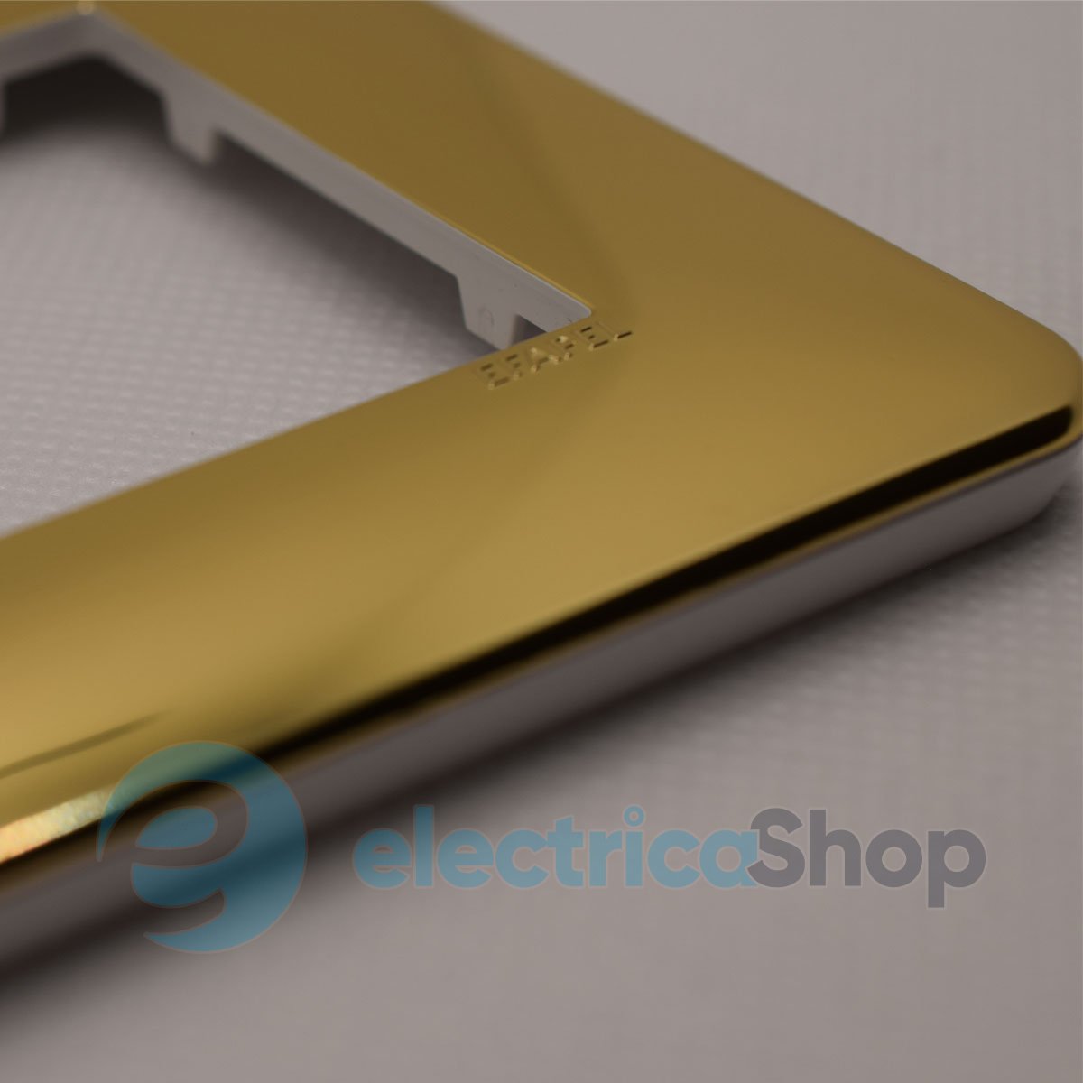 Рамка в цвете золота из коллекции «Latina» выполнена из пластика с имитацией металла и может устанавливается в горизонтальном и вертикальном положении.