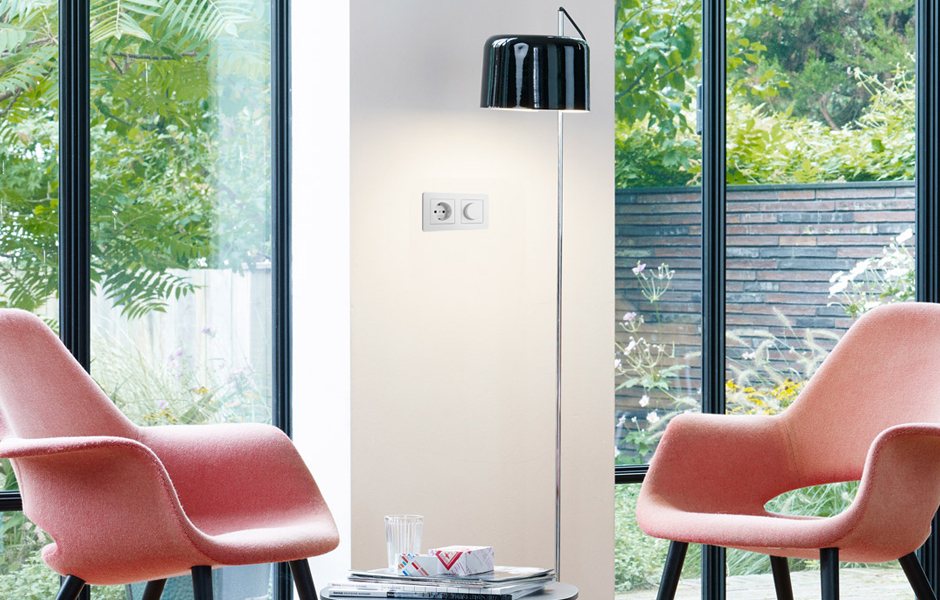 Комбинация рамки AF584BFWW с механизмами и накладками в глянцевом исполнении позволяют создавать яркие акценты.Пример рамок А Flow белый цвет в интерьере