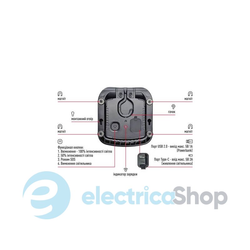 Имеет аккумулятор на 5000mAh, USB-разъемы (USB2.0 работает как power bank + type-C input max. 5V 2A) и кнопку для выбора режима освещения.