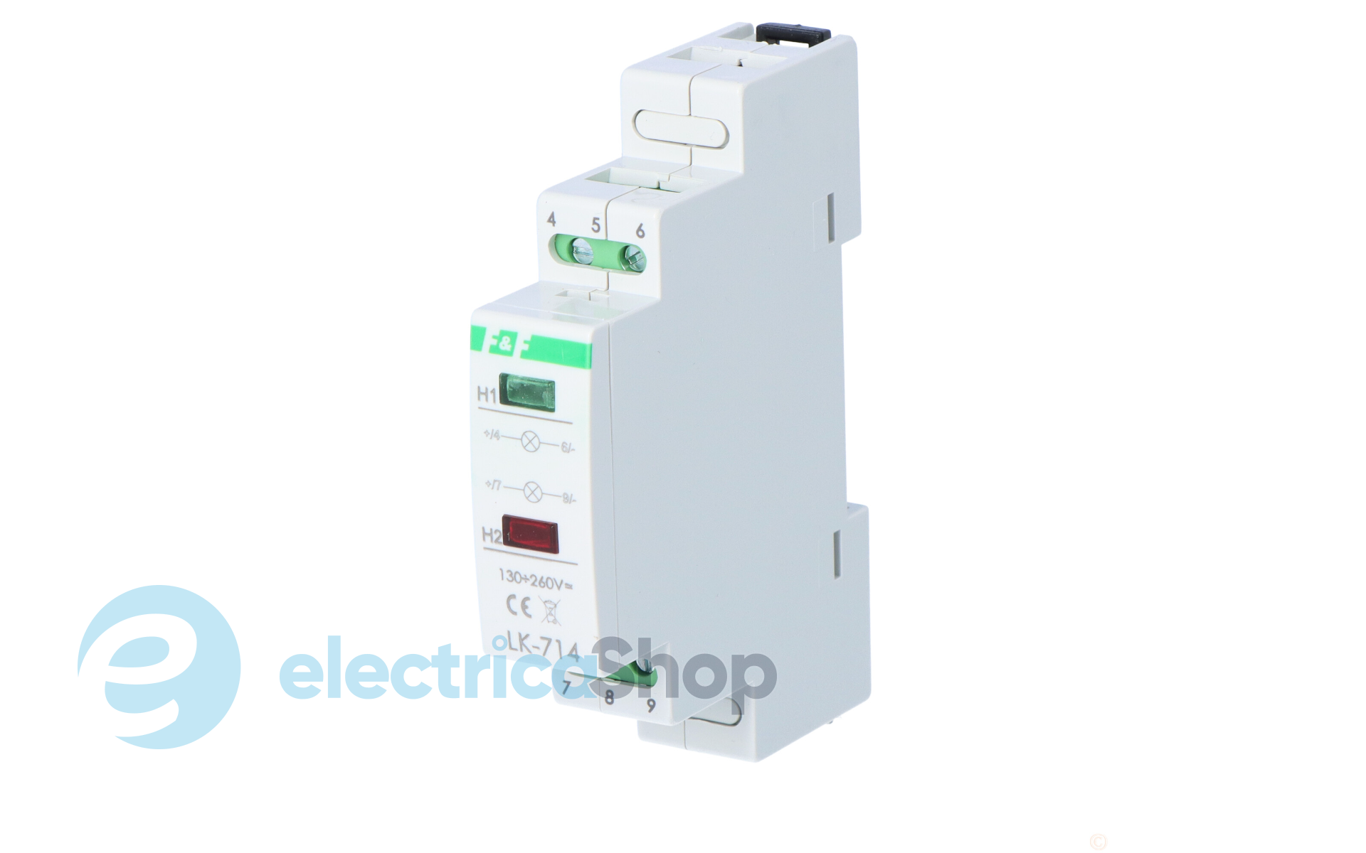Індикатор двох станів. Два світлодіоди. Кольори: зелений, червоний. Діапазон напруг 130÷260 В AC/DC. Індикатор LK-714 служить для візуальної сигналізації стану зазначених електричних кіл або приймачів, наприклад, закрито - відкрито; робота - перерва, і т. д.