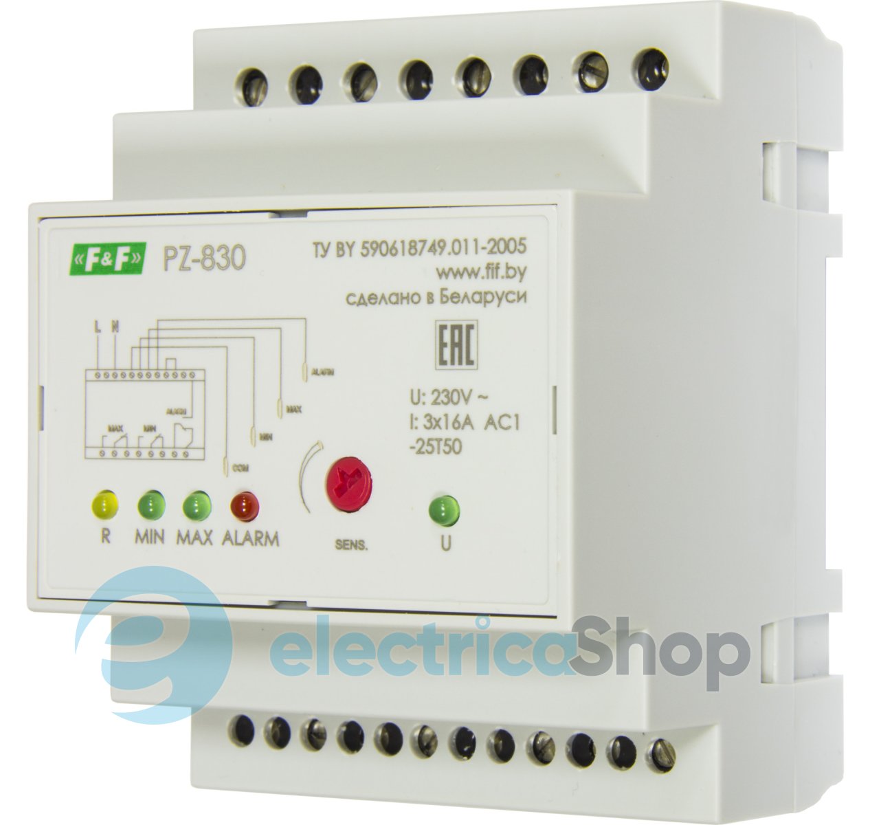 Реле PZ-830 предназначено для контроля и поддержания заданного уровня токопроводящих жидкостей в резервуарах, бассейнах, водонапорных башнях и т.п. и управление электродвигателями насосных установок Автомат контролирует наличие жидкости на трех уровнях. Третий уровень - аварийный. Автомат не используется для контроля дистиллированной воды, бензина, масла, керосина, этиленгликоля, сжиженного газа.