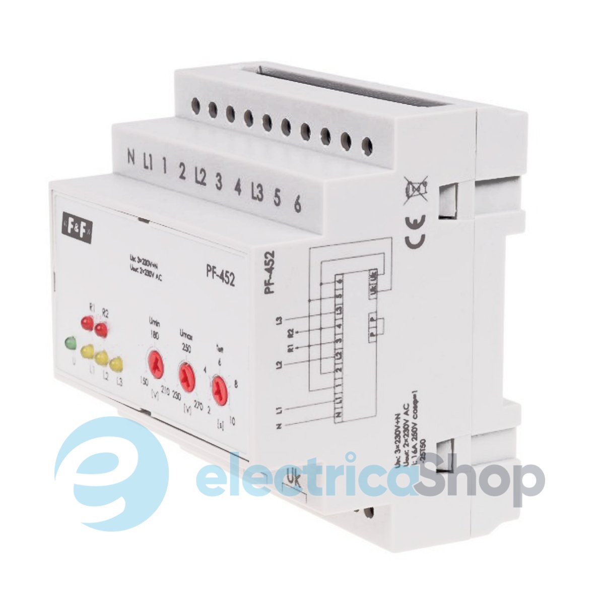 - Основные функции реле: Контроль напряжения, Задержка срабатывания, Переключение питания / нагрузки, Автоматическое переключение, Переключение фаз