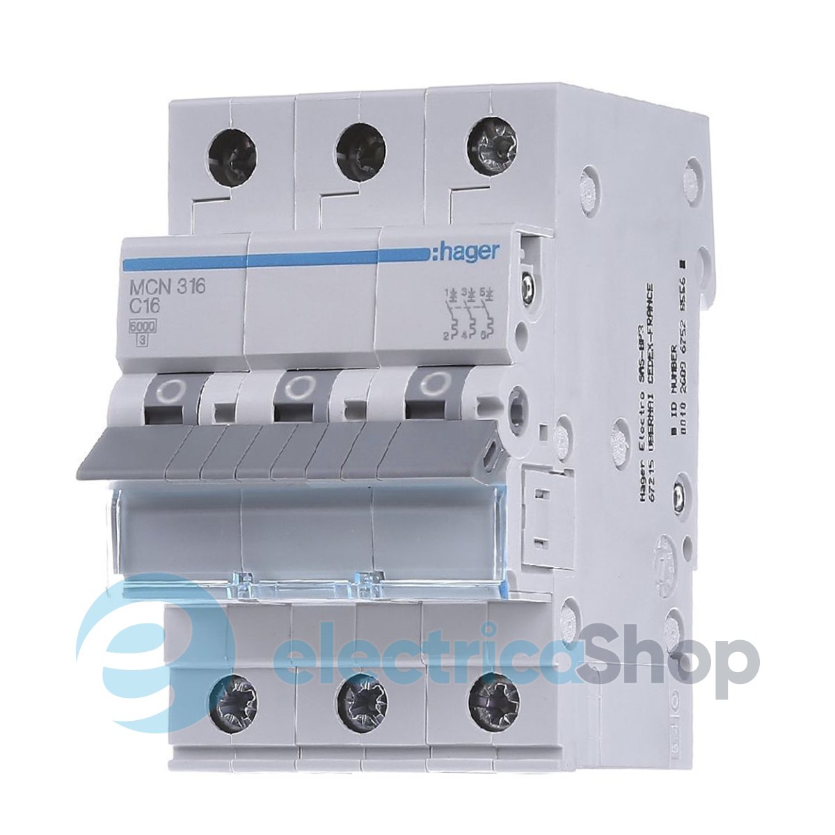 • Коммутационная способность : Автоматический выключатель должен быть способен безопасно отключать ожидаемый максимальный ток короткого замыкания в месте повреждения. Поэтому ожидаемый максимальный ток короткого замыкания всегда должен быть меньше коммутационной способности автоматического выключателя. Автомат Hager MCN316 предназначен для электросетей с максимальным током короткого замыкания 6кА, что является достаточным параметром для бытовых и промышленных сетей.