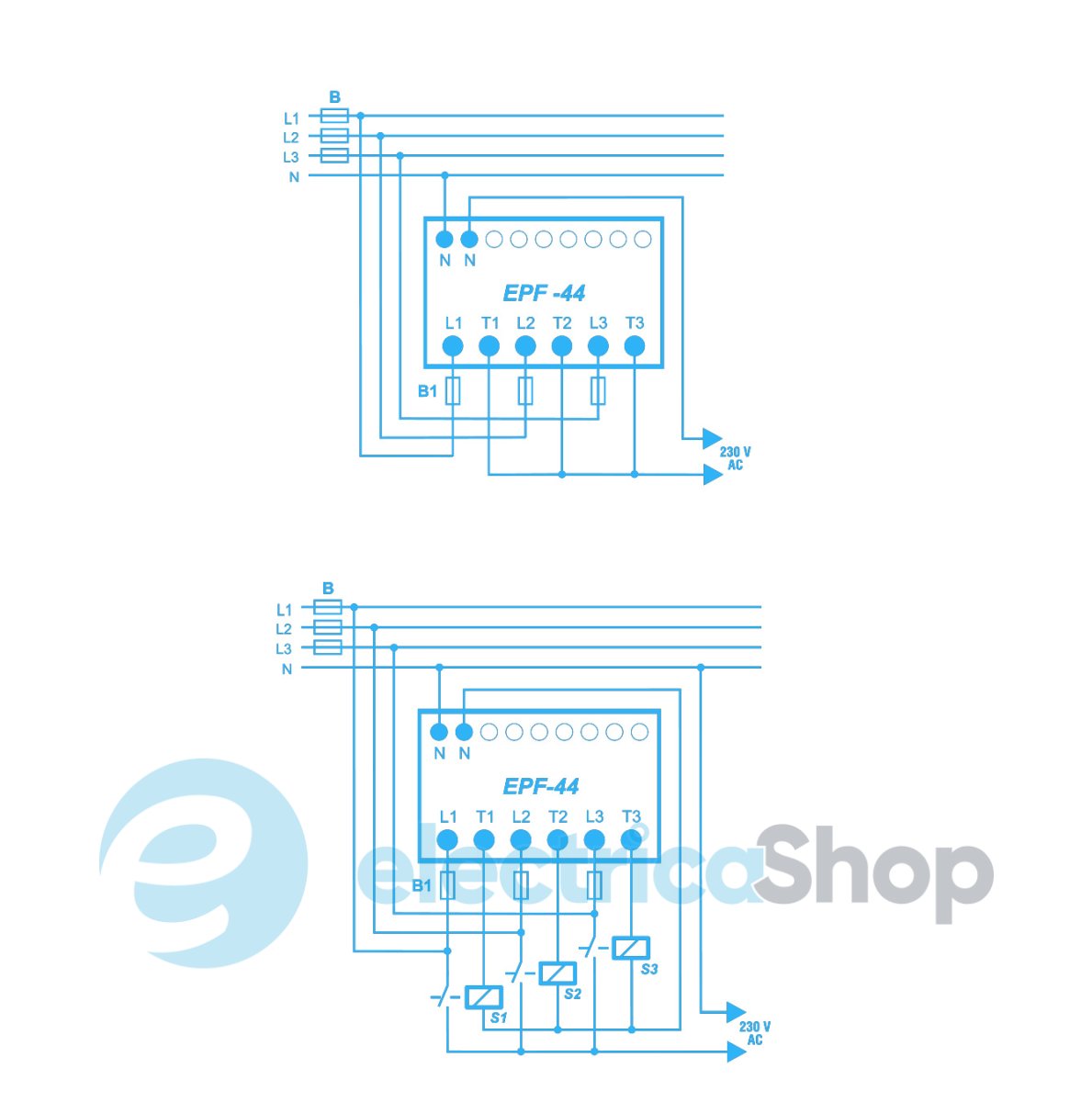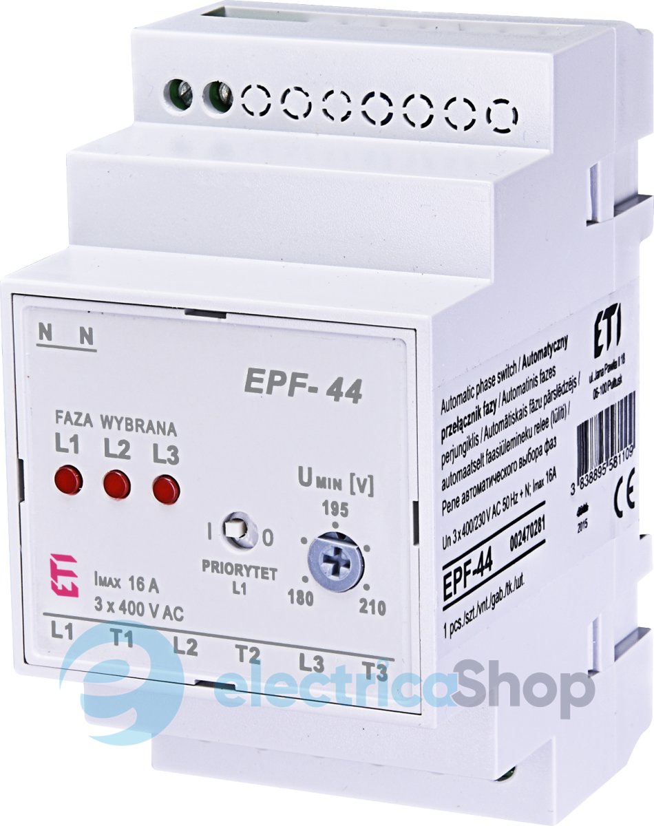 Реле автоматического выбора фаз применяются для обеспечения бесперебойного питания однофазной нагрузки (оборудования) при снижении напряжения или обрыва одной или двух фаз трехфазной сети питания. Имеет возможность выбора приоритетной фазы. Реле EPF-44 имеет независимые выходы, которые дают возможность подключения контакторов для увеличения нагрузочного тока (устройств) свыше 16A (AC1).