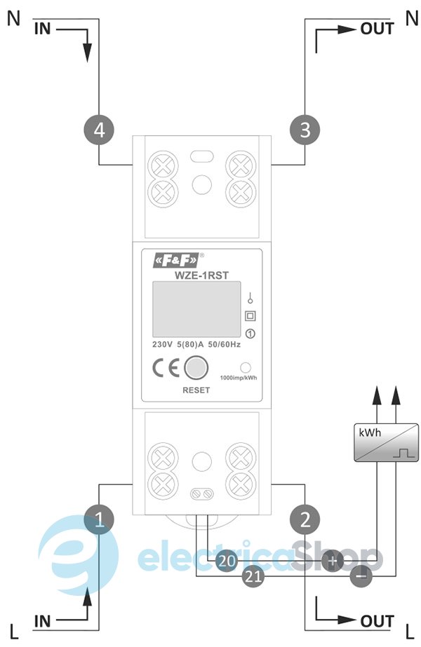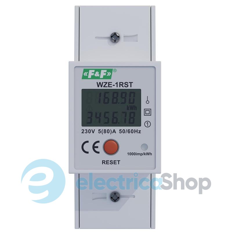 WZE-1RST является статическим (электронным) устройством для измерения потребления электроэнергии однофазного переменного тока в прямой системе подключения. Он оснащен 2 индикаторами (строками) потребления энергии, которые отображаются одновременно. Один показывает общее потребление энергии, а другой показывает потребление энергии с момента последнего сброса счетчика. Специальная электронная система под влиянием тока и приложенного напряжения генерирует импульсы в количестве, пропорциональном потребляемой электроэнергии. Количество потребляемой энергии отображается на дисплее счетчика. Кроме того, потребление энергии отображается мигающим красным светодиодом.