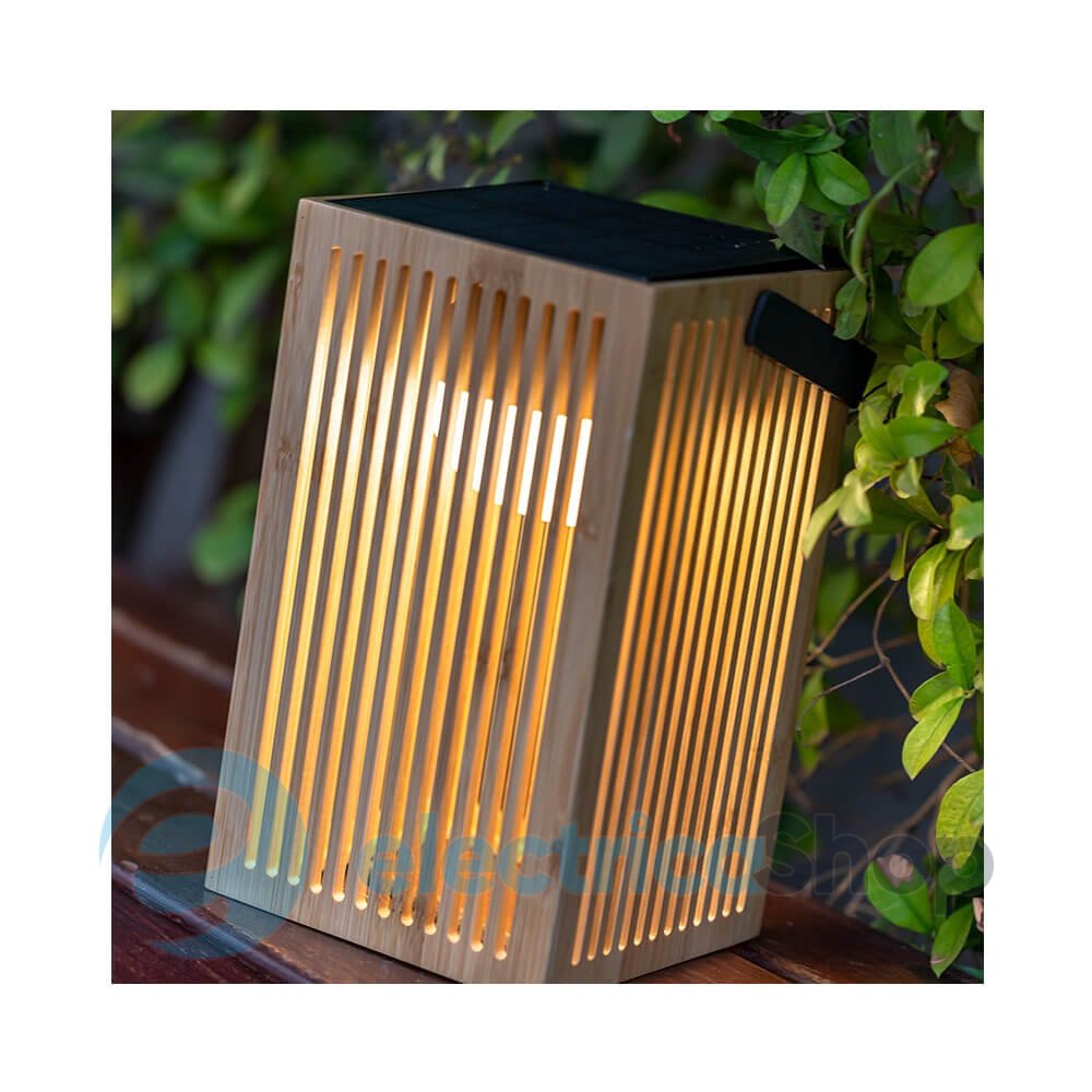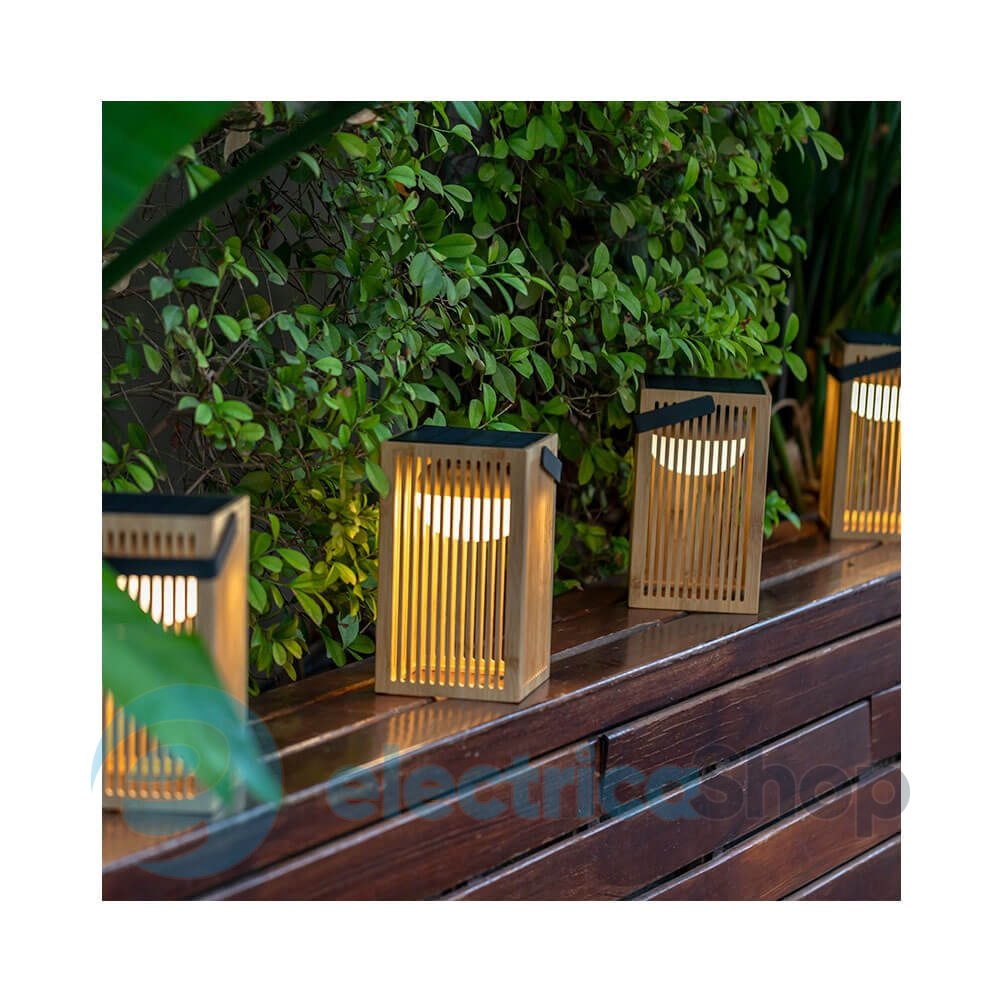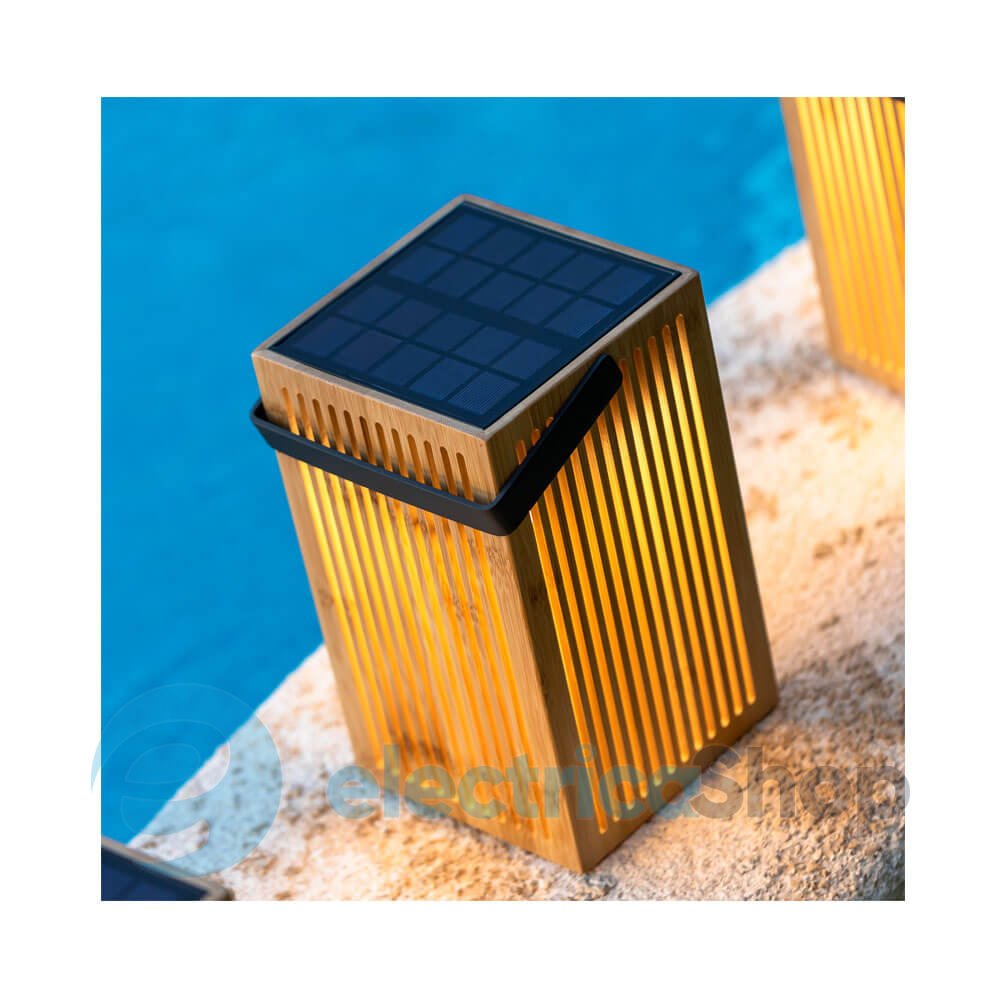 Уличный переносной светильник NEWGARDEN OKINAWA LANTERN (LUMOKL024XXSLNW) имеет приятный минималистичный дизайн: корпус светильника выполнен из бамбука, ручка из металла. На крышке фонаря размещена солнечная батарея.