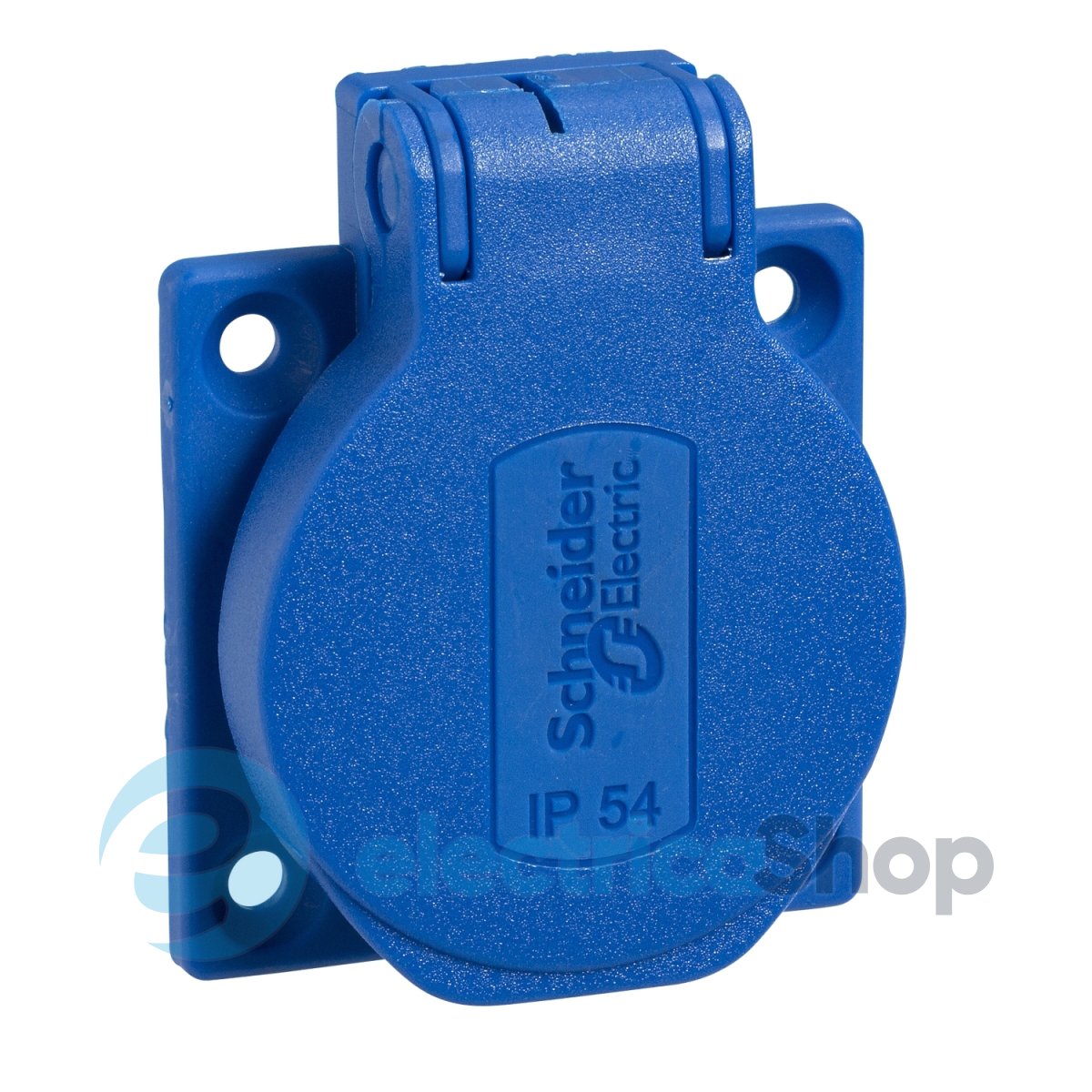 Промислова розетка SСHUKO Kaedra Box з гвинтами, що не випадають. Конфігурація полюсів: SСHUKO 2P+E, номінальний струм 16А, робоча напруга 250V змінного струму. Ступінь захисту : IP54. Частота 50Гц чи 60Гц. Положення контактів за годинниковою стрілкою - 6 год.