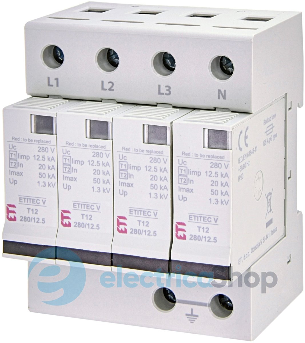Ограничитель перенапряжения ETITEC V T12 280/12,5 (4+0) (2442907) предназначен для установки внутри объектов (зданий). В соответствии с VDE стандартом защиты от перенапряжения определяются как класс В, С. В соответствии со стандартом ИЭС определяются как категория I, II и в соответствии с EN – тип 1, тип 2. Устанавливаются в главных распределительных щитах для защиты сетей от перенапряжения, прямого и косвенного удара молнии, наведенного и индуцированного перенапряжения. В случае выхода из строя ограничителя перенапряжения срабатывает тепловая защита и визуальный индикатор, сигнализирующий о необходимости замены устройства.