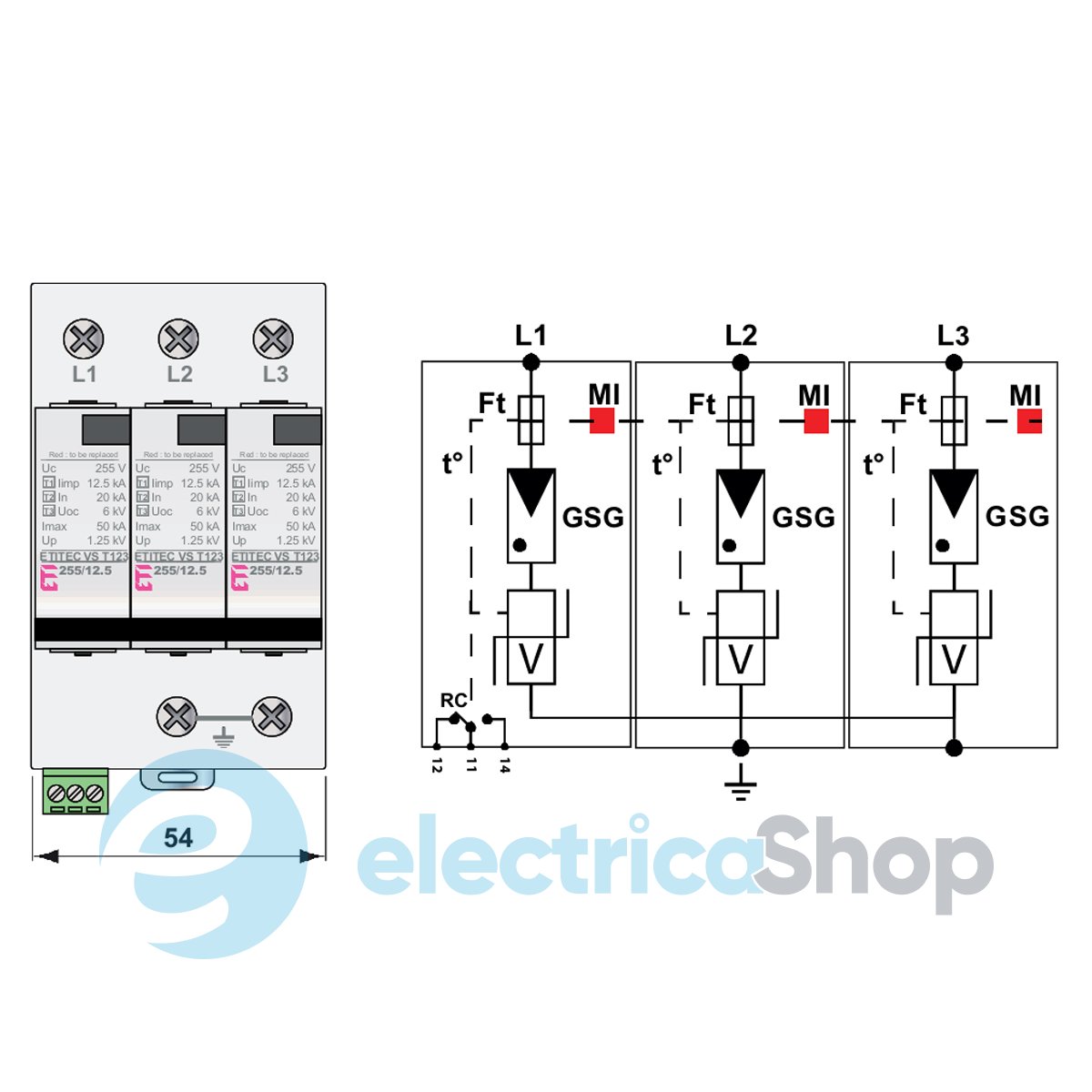 В случае выхода из строя ограничителя перенапряжения срабатывает тепловая защита и визуальный индикатор, сигнализирующий о необходимости замены устройства. Замене подлежит только поврежденный модуль SPD, при этом нет необходимости замены базового блока.ПЗИП тип модели: ETITEC VS T123 255/12,5 (3+0) группы B+C+D (тип I+II+III)
