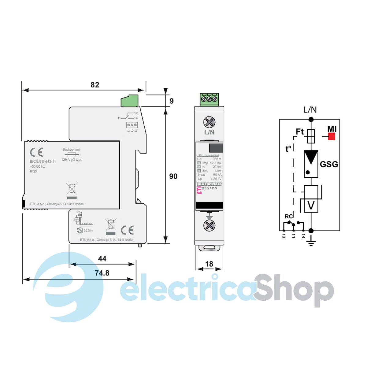 Ограничитель перенапряжения тип I+II+III, ETITEC VS T123 255/12,5 (1+1) ETI 2442922