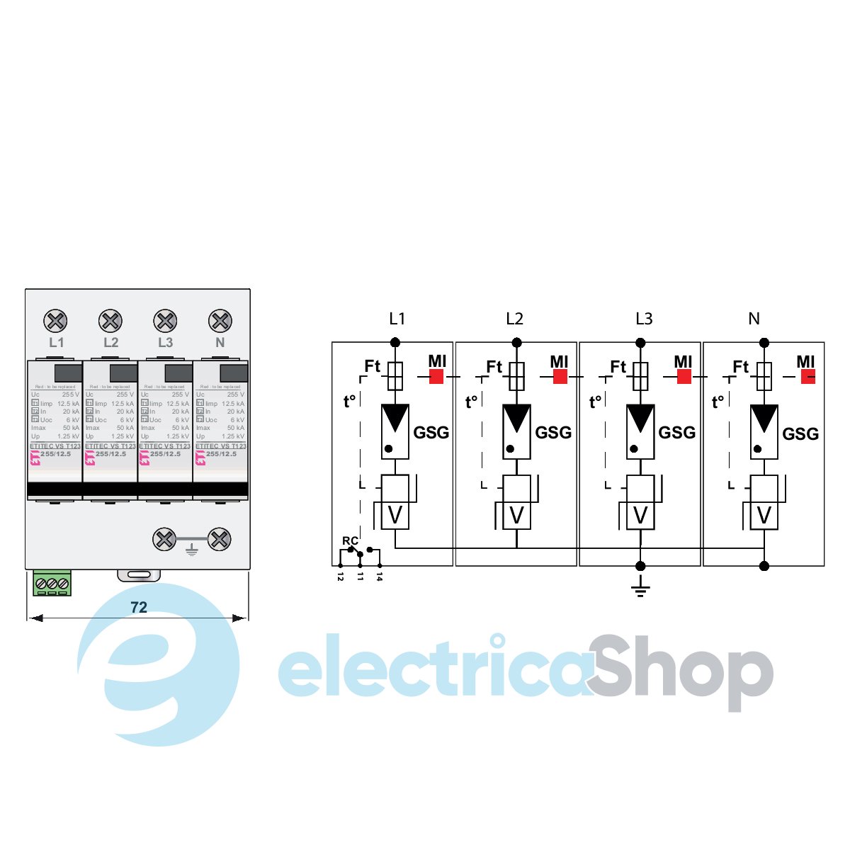 В случае выхода из строя ограничителя перенапряжения срабатывает тепловая защита и визуальный индикатор, сигнализирующий о необходимости замены устройства. Замене подлежит только поврежденный модуль SPD, при этом нет необходимости замены базового блока.ПЗИП тип модели: ETITEC VS T123 255/12,5 (4+0) RC группы B+C+D (тип I+II+III)
