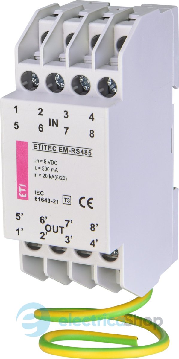 Встроенные соединительные резисторы выполняют функцию координирующих устройств между грубой и максимальной степенями защиты. Защитный модуль также оборудован термозащитой, которая в случае замыкания силовых цепей на информационную линию отводит импульс перенапряжения на контур заземления. Тепловая защита в этом случае обеспечивает пожаробезопасность, предотвращает перегрев основного модуля.Технические характеристики ETITEC EM-RS485: