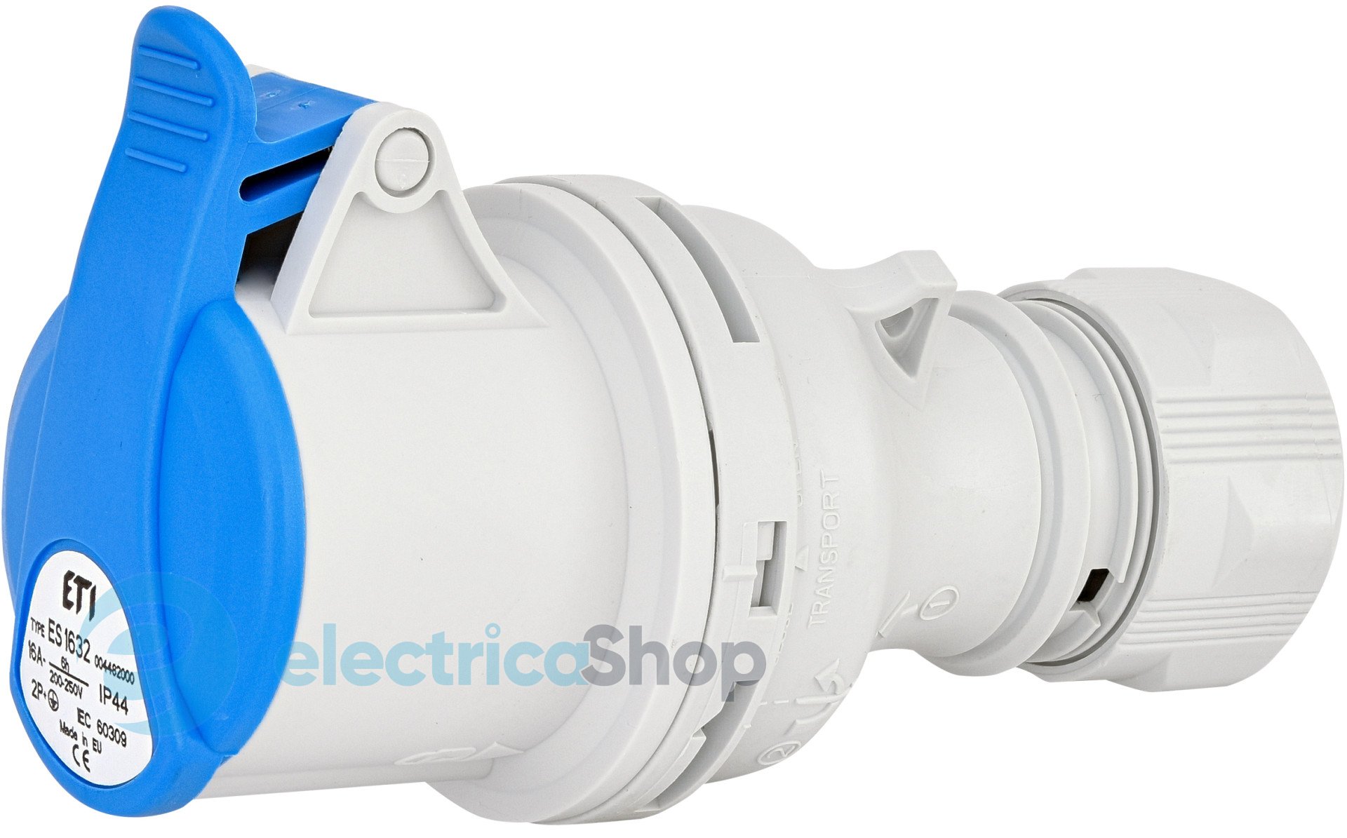 CEE Socket, ES 1632, Ступінь захисту IP IP44, Кількість полюсів 2+PE, Номінальний струм (A) 16, Номінальна напруга (В) 230, Тип розетка вилка Розетка кабельна, Максимальна сила струму 16 A, Сила струму відповідно до UL / CSA (для UL-виконання) A, Кількість полюсів 2 , Напруга відповідно до EN 60309-2 і колір 230 В (50+60 Гц) синя , Положення ключа в годинах / Орієнтація заземл. контакту (по цифербл. годинника) h, Маркувальне забарвлення Синій , Номер кольору Ral , Ступінь захисту IP IP44 , Спосіб підключення Гвинтова клема , Кут підключення Прямолінійний (-а) , Кабельний ввід Ущільнювальна гайка , Матеріал Пластик , Виконання для збройних сил