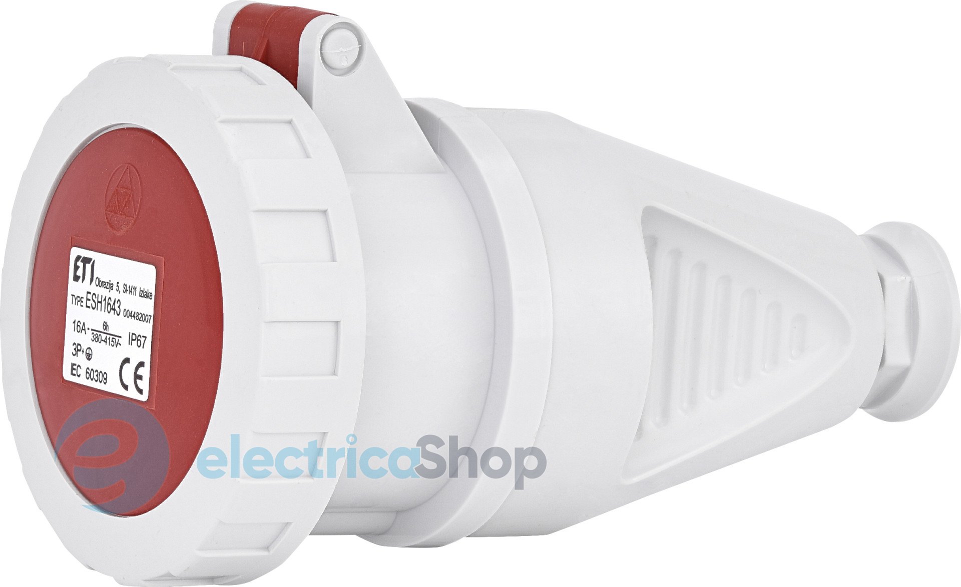 CEE Socket, ESH 1643, Ступінь захисту IP IP67, Кількість полюсів 3+PE, Номінальний струм (A) 16, Номінальна напруга (В) 400, Тип розетка вилка Розетка кабельна, Максимальна сила струму 16 A, Сила струму відповідно до UL / CSA (для UL-виконання) A, Кількість полюсів 3 , Напруга відповідно до EN 60309-2 і колір 400 В (50+60 Гц) червона , Положення ключа в годинах / Орієнтація заземл. контакту (по цифербл. годинника) 6 h, Маркувальне забарвлення Червоний , Номер кольору Ral , Ступінь захисту IP IP67 , Спосіб підключення Гвинтова клема , Кут підключення Прямолінійний (-а) , Кабельний ввід Ущільнювальна гайка , Матеріал Пластик , Виконання для збройних сил