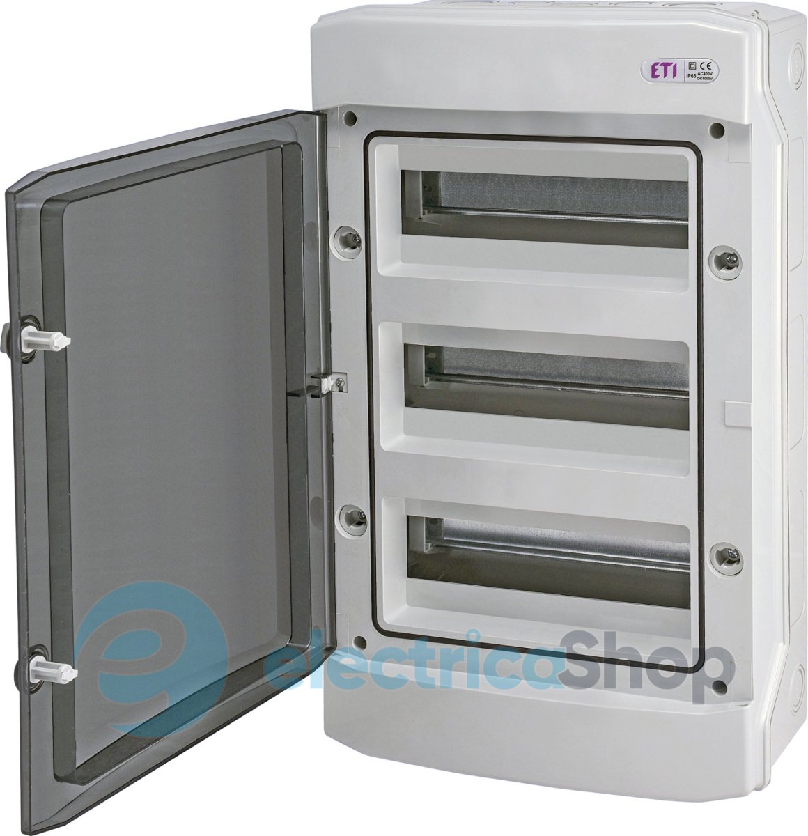 <р> Герметичный распределительный щит ETI ECH 36PT навесного монтажа используются в жилом, промышленном строительстве, а также в фотоэлектрических системах солнечных станций для монтажа защитных, сигнальных и распределительных устройств модульного исполнения и обеспечивают степень защиты IP65. <р> Распределительный бокс ETI ECH 36PT имеет 36 стандартных модулей, размещенных в три ряда (3 ряда по 12 модулей).