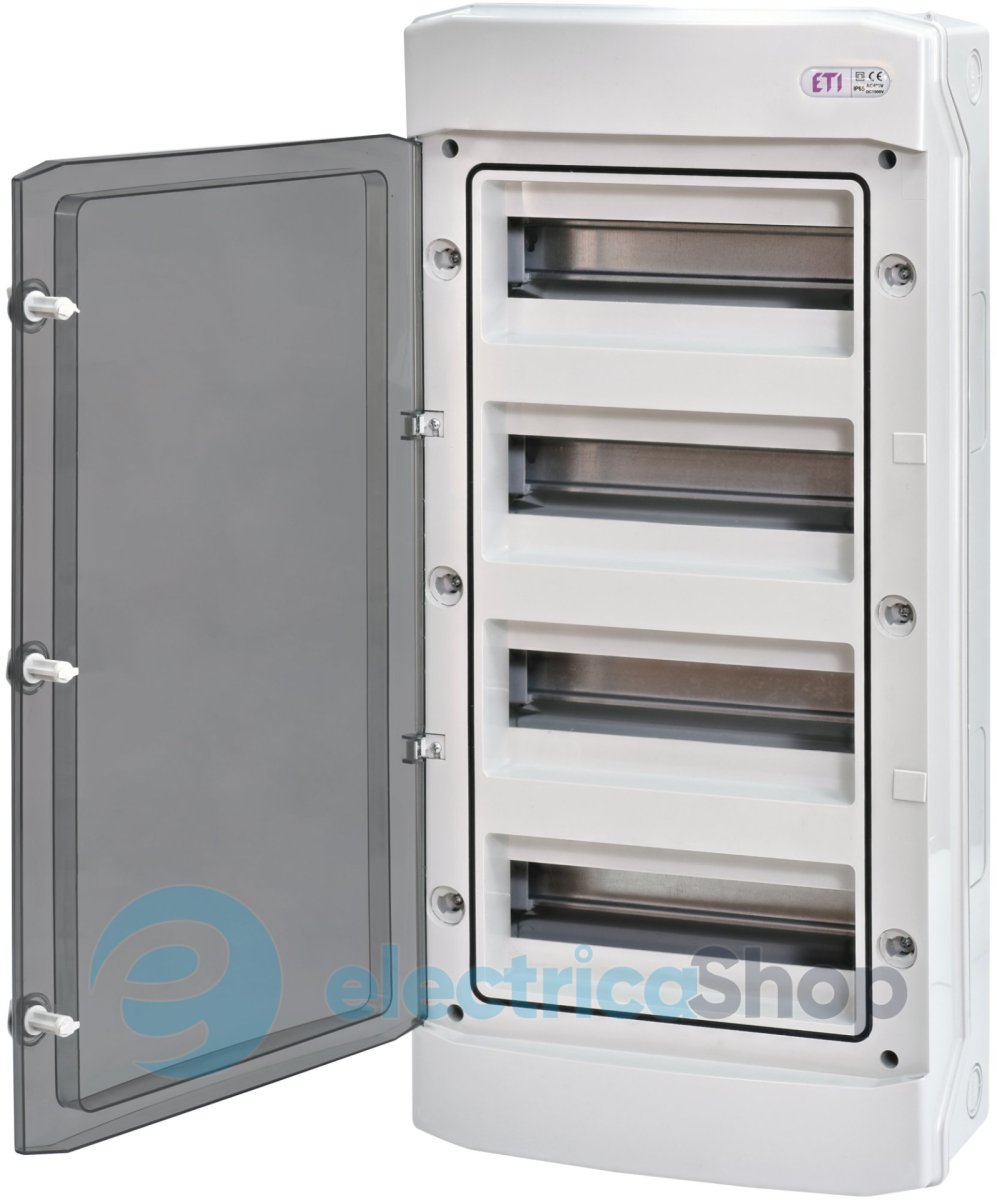 <р> Герметичный распределительный щит ETI ECH 48PT навесного монтажа используются в жилом, промышленном строительстве, а также в фотоэлектрических системах солнечных станций для монтажа защитных, сигнальных и распределительных устройств модульного исполнения и обеспечивают степень защиты IP65. <р> Распределительный бокс ETI ECH 48PT имеет 48 стандартных модулей, размещенных в четыре ряда (4 ряда по 12 модулей).