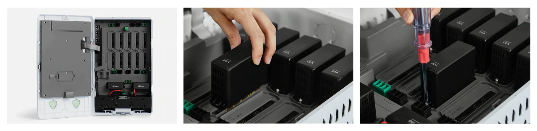 Замена без влияния на другие схемы. Каждый модуль имеет два модуля и предохранитель для защиты от перегрузки по току для каждой цепи. Это означает, что вы можете заменить один модуль, не влияя на другие схемы. Если вам нужно заменить релейный модуль, приложение EcoFlow и встроенный светодиод уведомят вас о любых ошибках.