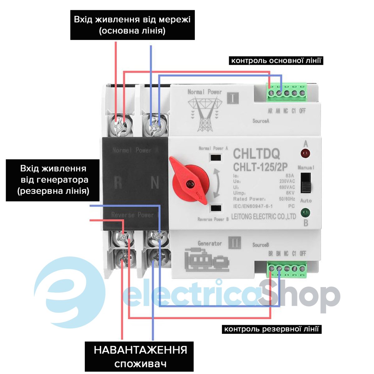 При возобновлении основного электропитания переключатель автоматически переключит потребителя на основное питание.- Тип: 2-полюсный АВР для 1-фазной сети.