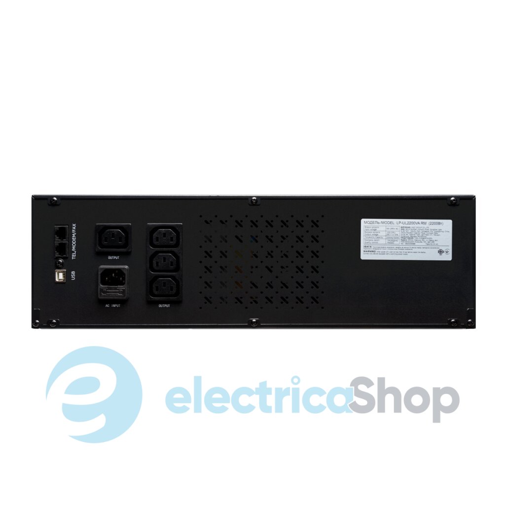 Джерело безперебійного живлення LP-UL2200VA RM (rack mounts) (with battery) (лінійно-інтерактивний тип) має показник потужності - 2200/1300 VA/W і вхідну напругу - 220/230/240 ± 10% V. Захисний функціонал інтерактивного джерела безперебійного живлення LP-UL2200VA RM (rack mounts) (with battery) має наступні типи захисту: від короткого замикання, стрибків напруги, перевантаження, розряду і надлишкового заряду батарей. Автопідзарядка пристрою виконується у вимкненому стані. Має 2 євророзетки, функції холодного старту та повторного запуску при відновленні напруги в мережі. ДБЖ має технологію триступінчастої зарядки АКБ, що значно скорочує час перезарядки. Завдяки технології інтелектуального керування акумулятором його заряджання відбувається з урахуванням температурної компенсації, що збільшує термін служби акумулятора.